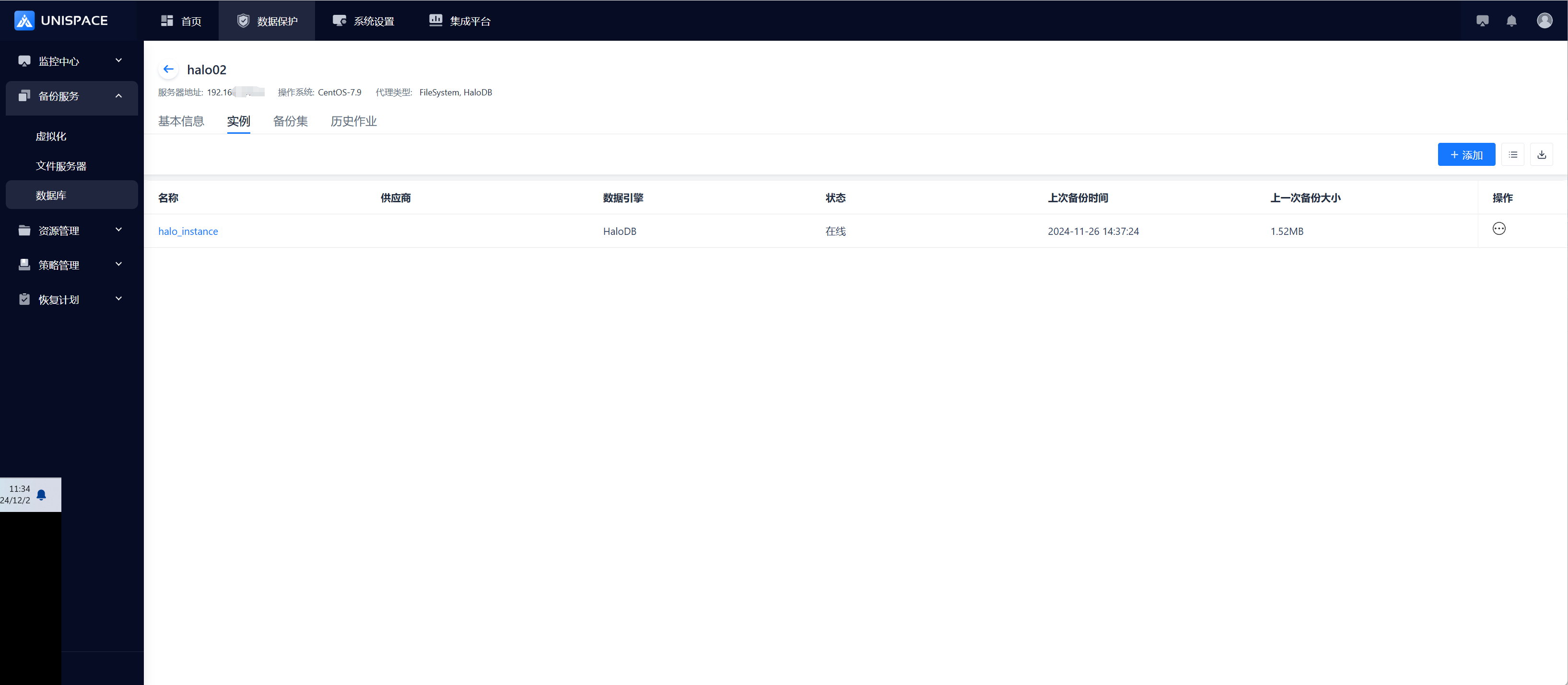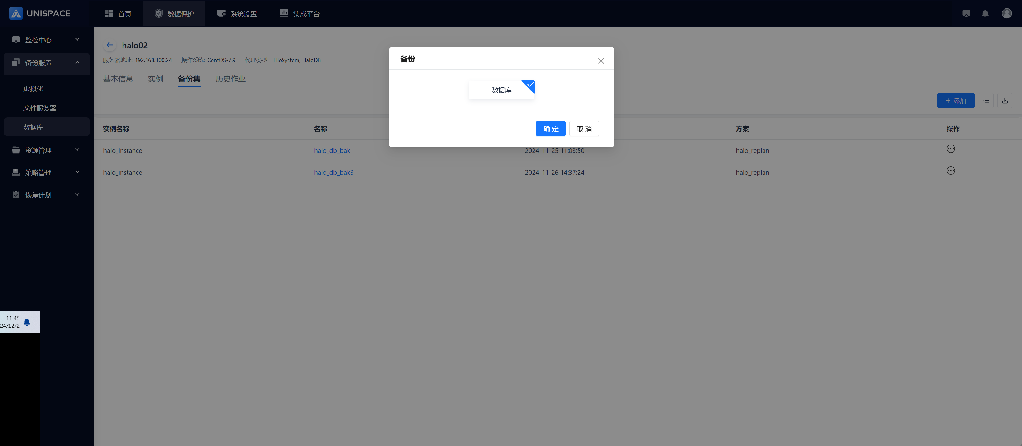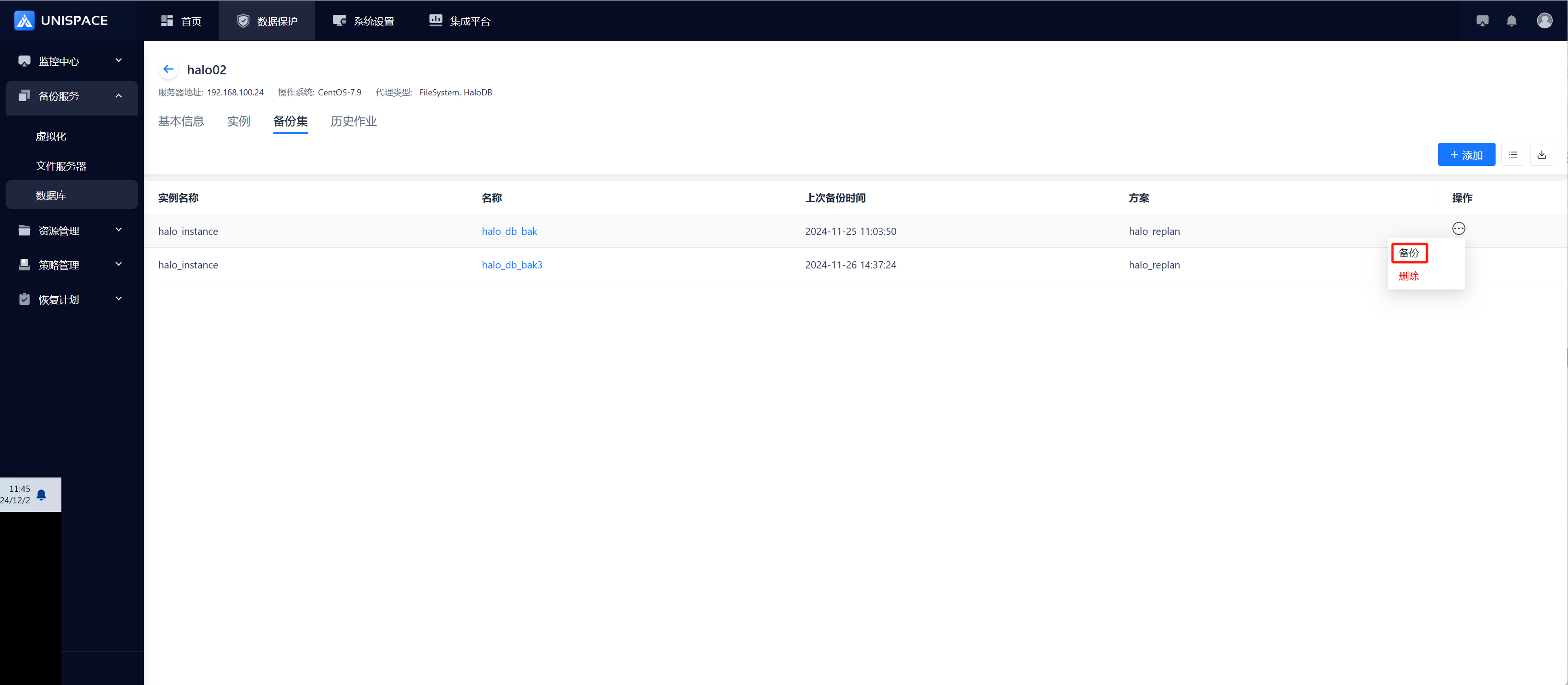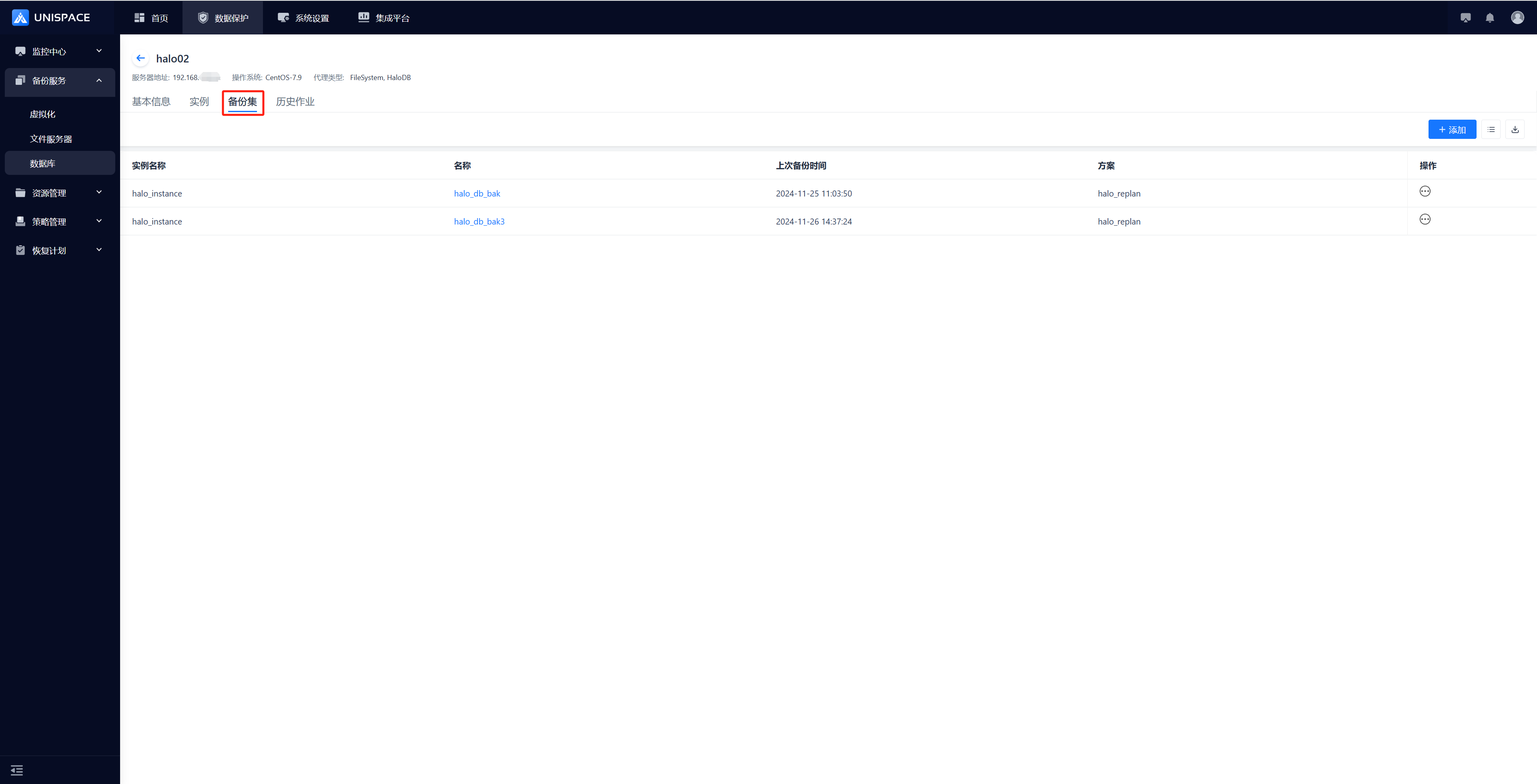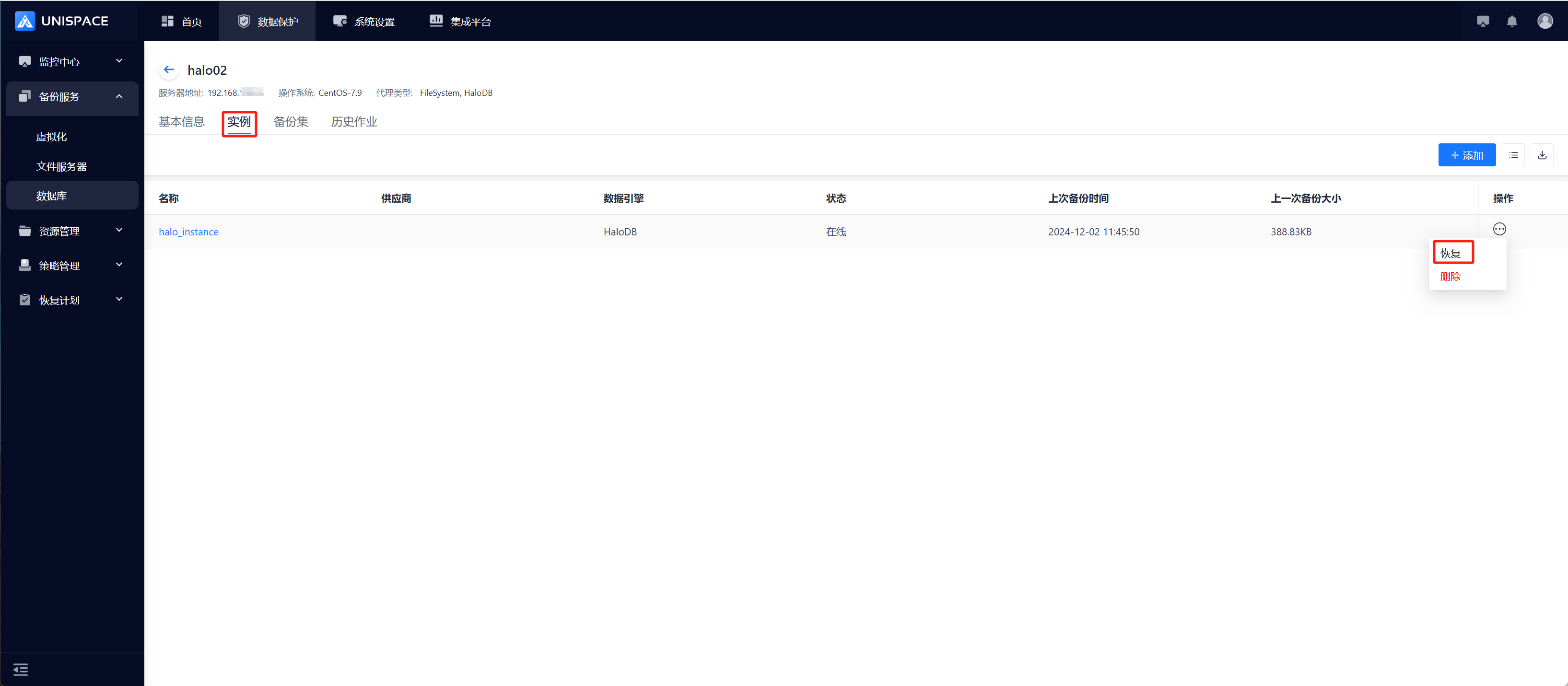 Step 1: Click Backup Service - Database from the system menu, then select the "Server Name" to enter the database instance page.