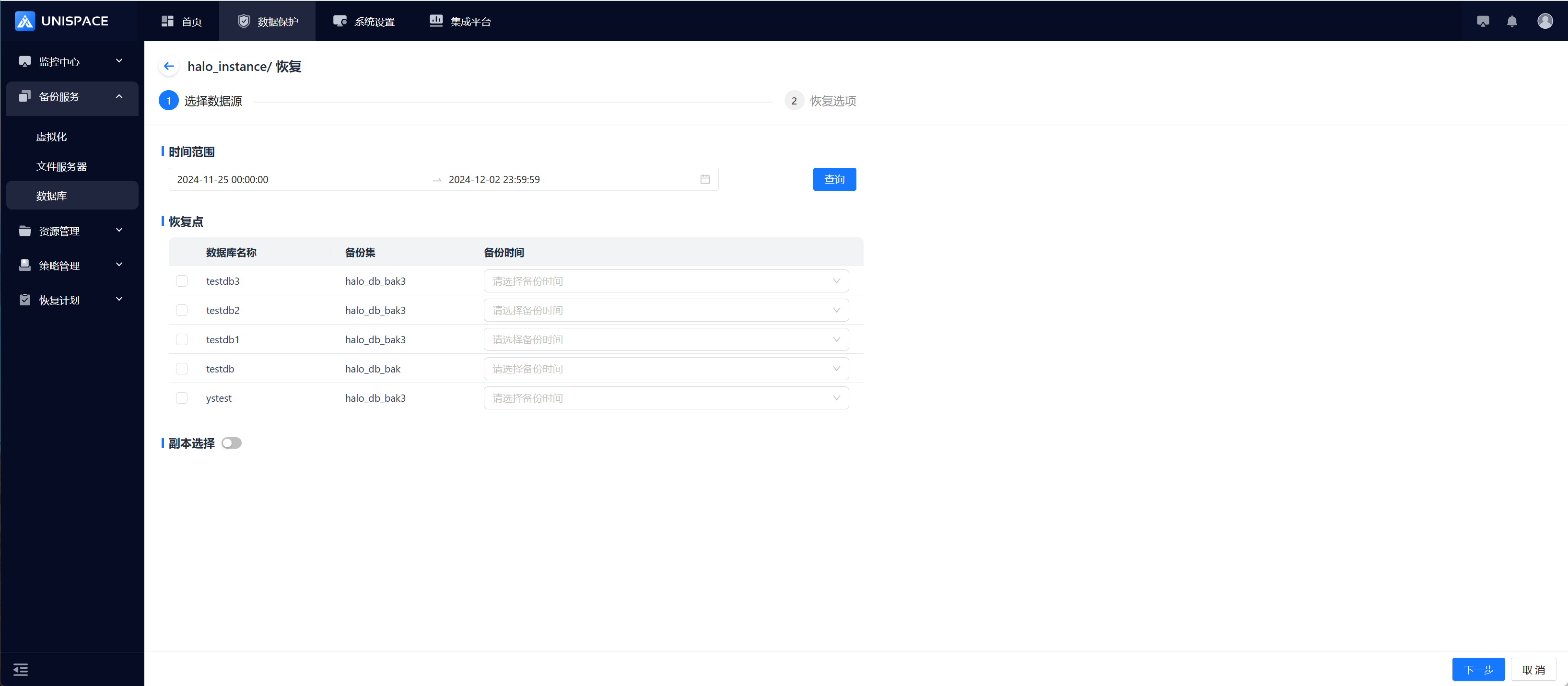 Step 3: A restore window will pop up. Choose a restore point based on the time range, select Database and Backup Time, and click Next (cross-backup set recovery is not supported).