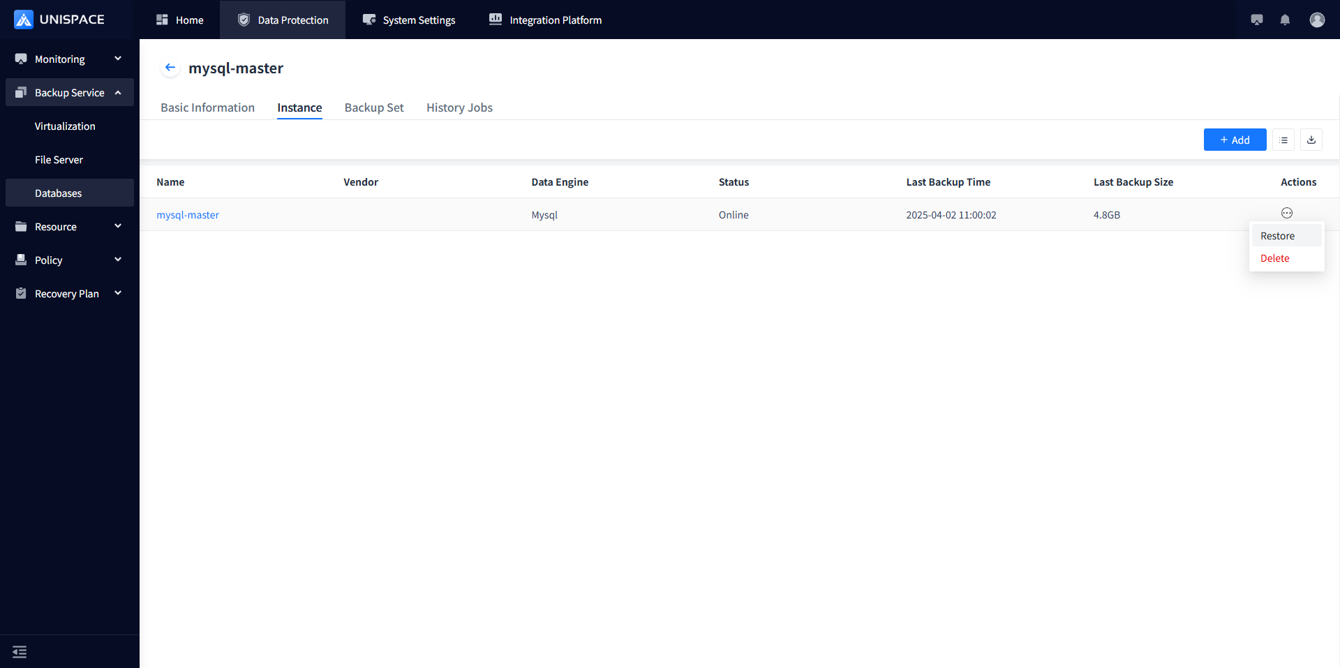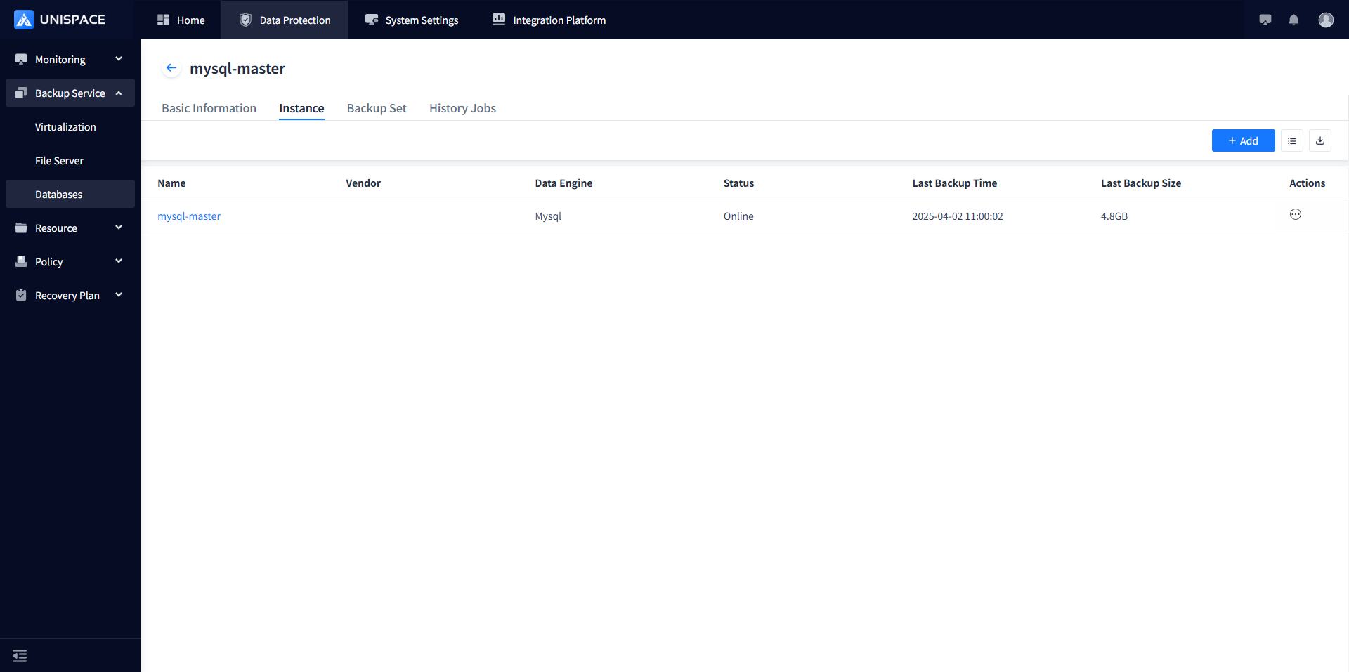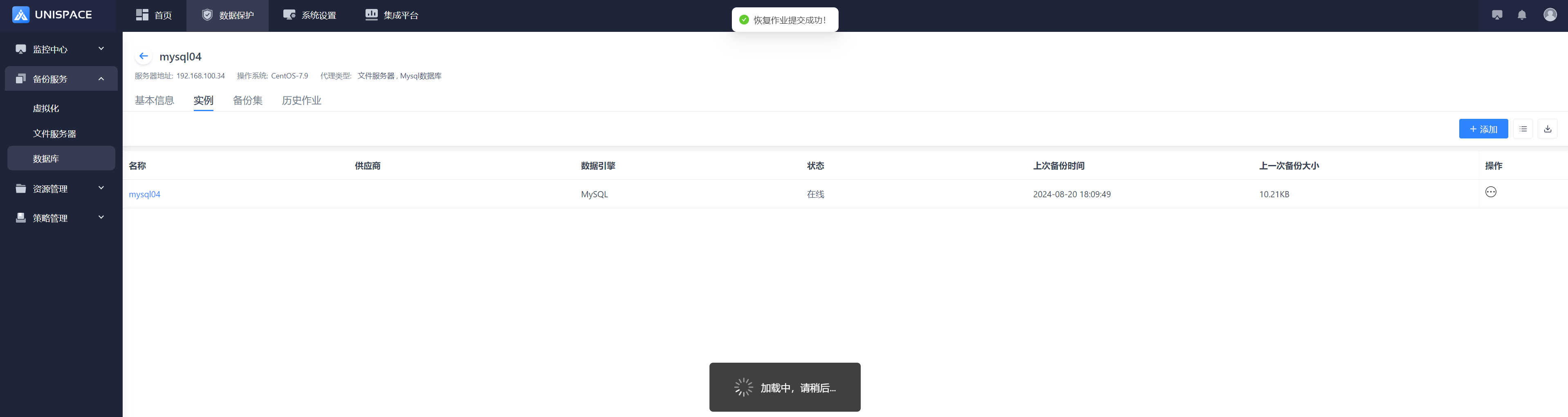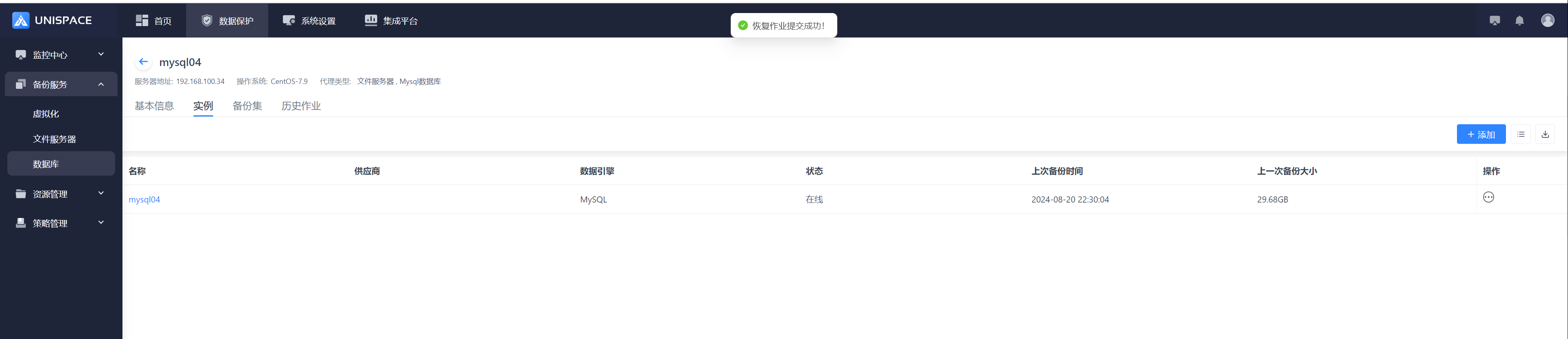 Step 1: Click the system menu Backup Service - Database list "Server Name" to enter the database instance page.