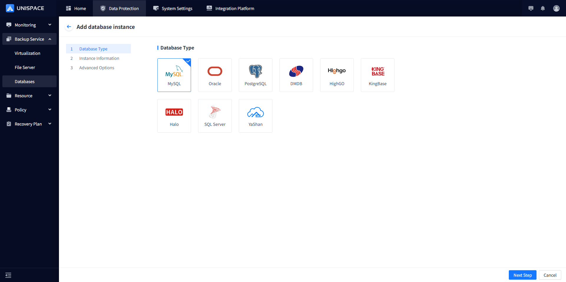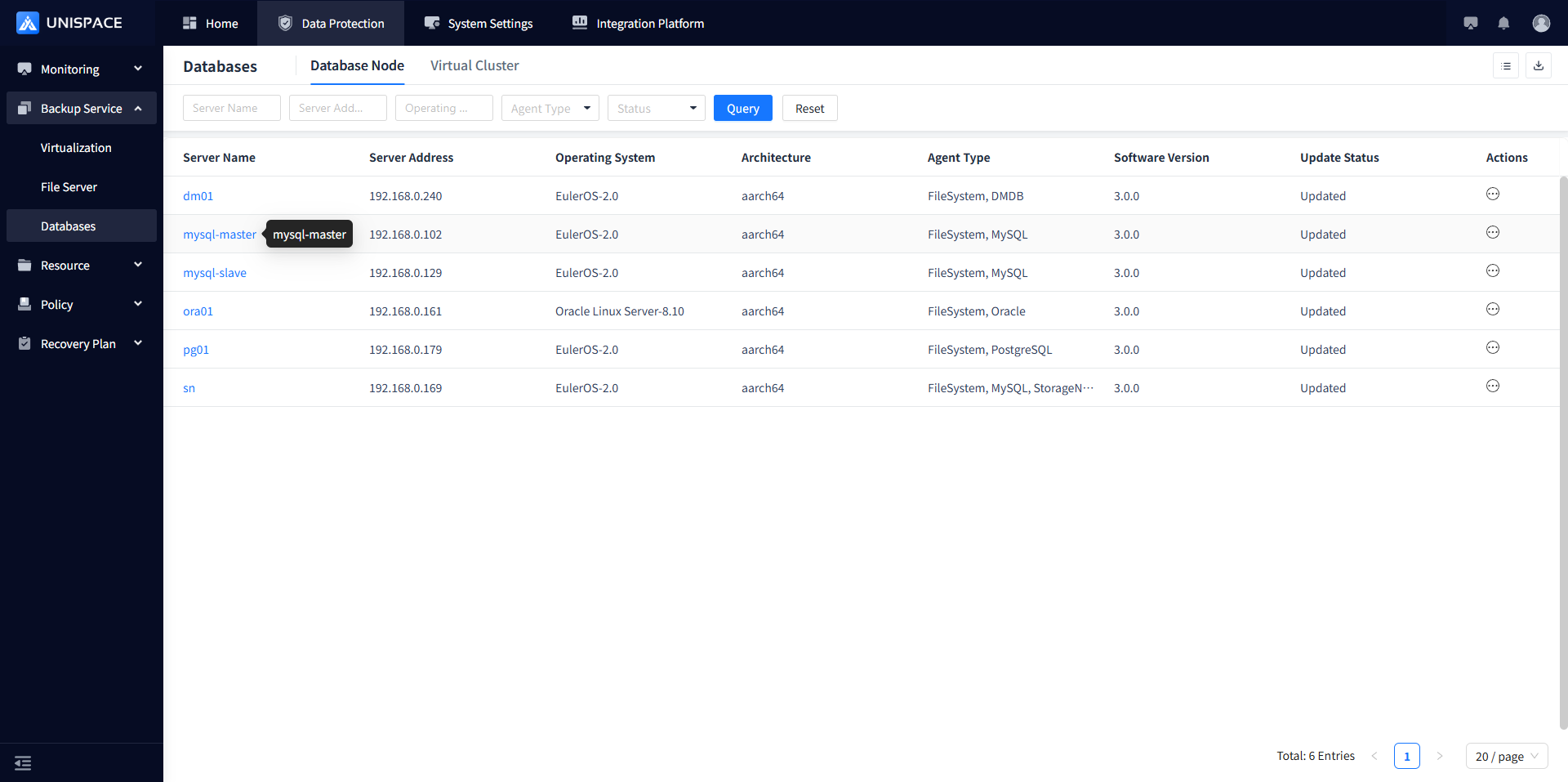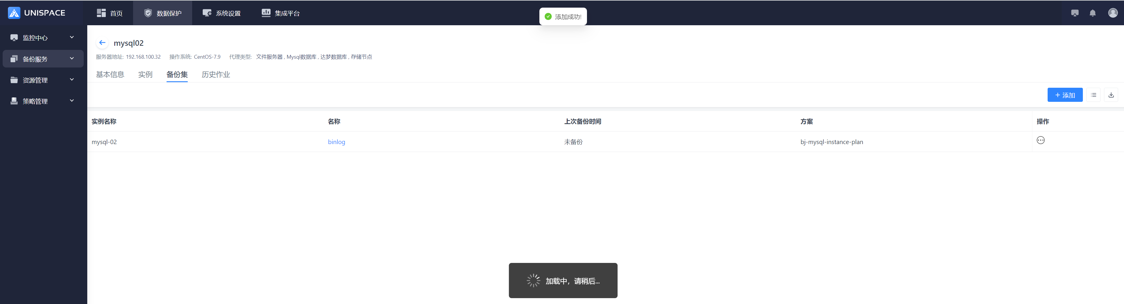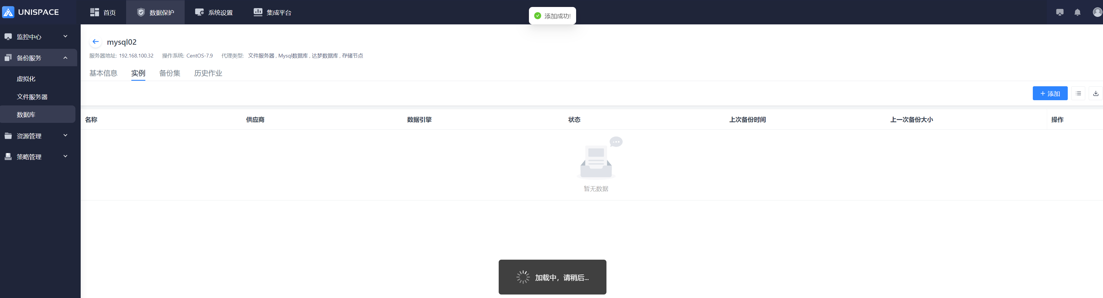 Step 1: Click the system menu Backup Service - Database list "Server Name" to enter the database instance page.