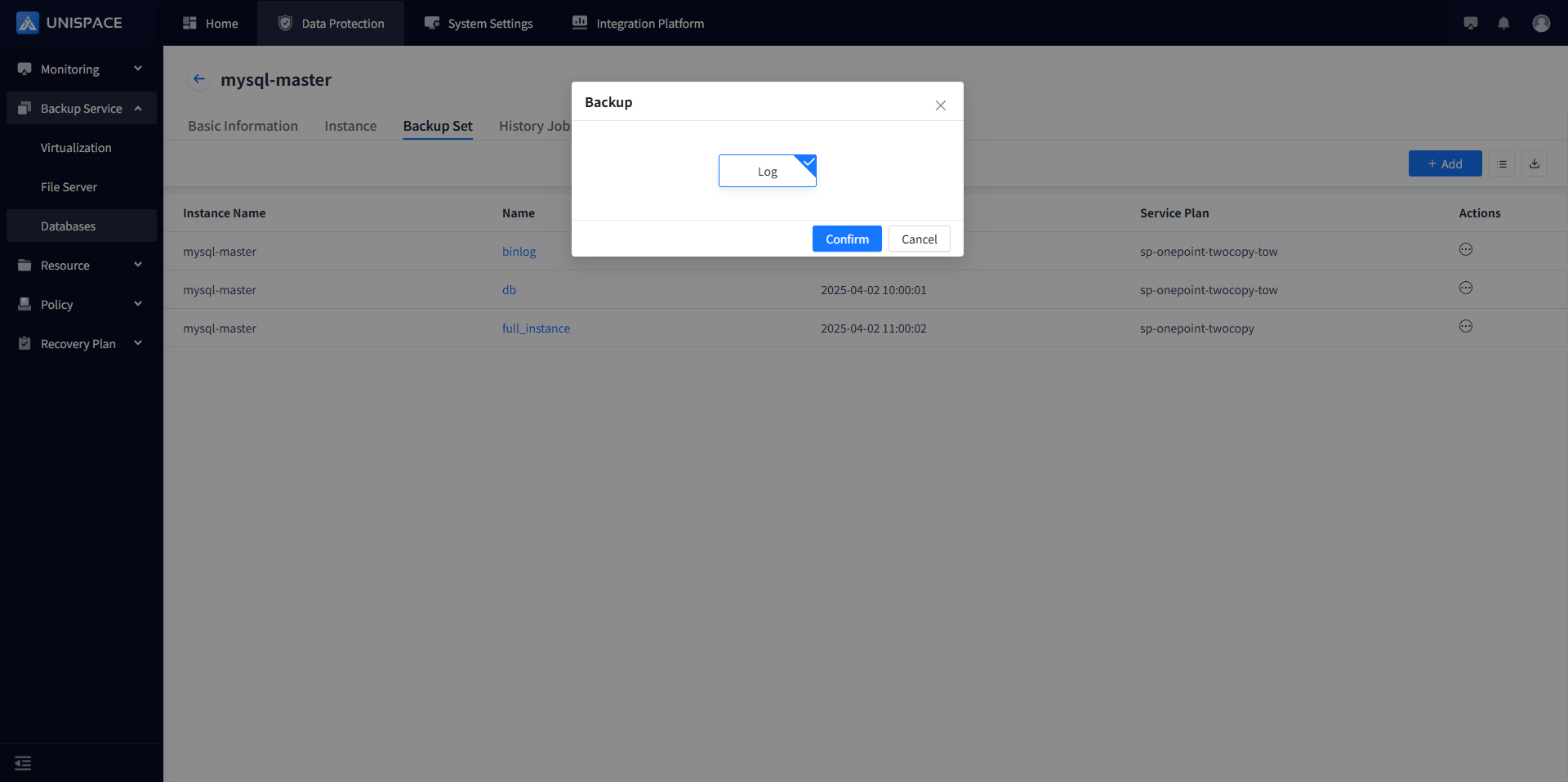 Step 3: Select "Log" and click Confirm. The page will prompt "Backup job submitted successfully".
