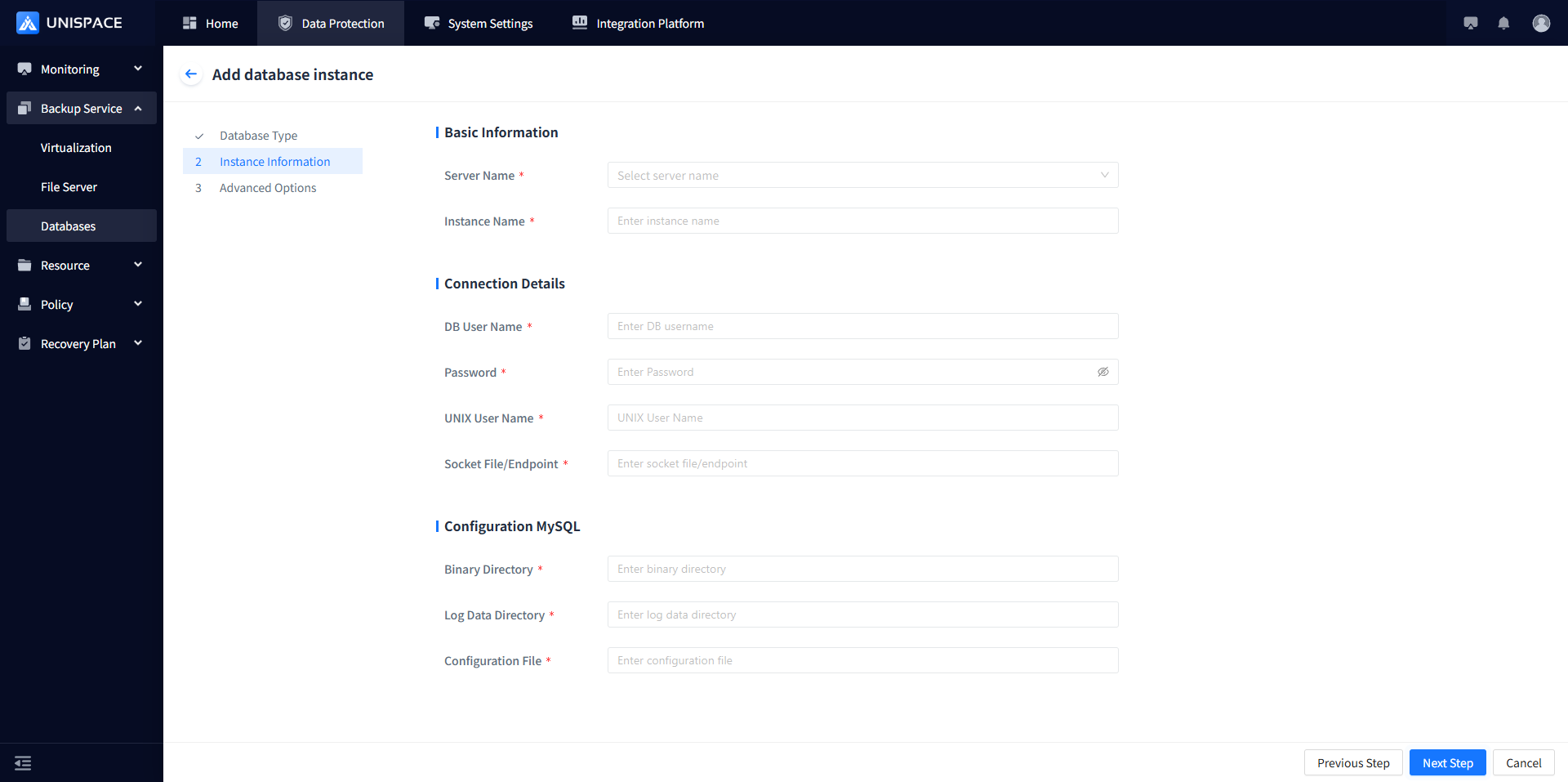 | Log Data Directory | Text input, required | Enter the correct MySQL log directory |