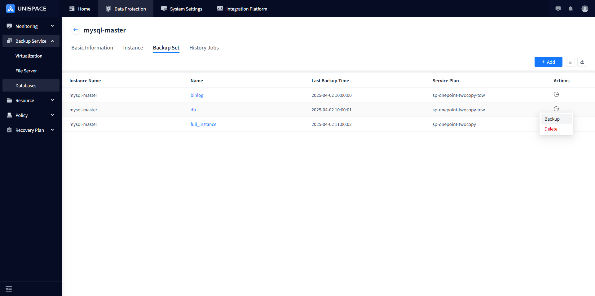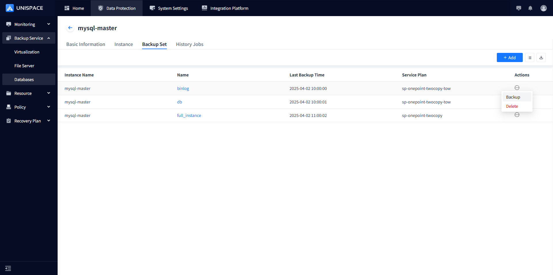 Step 2: Click Backup Set - Actions column - Non-binlog backup set - Backup.