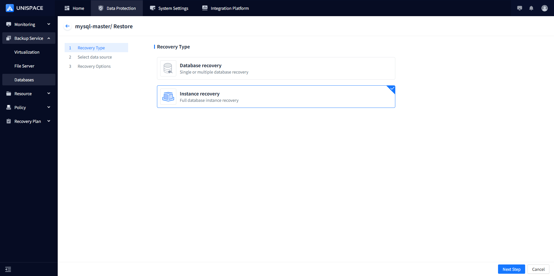Step 3: A recovery window will pop up. Select "Instance Recovery" and click Next.