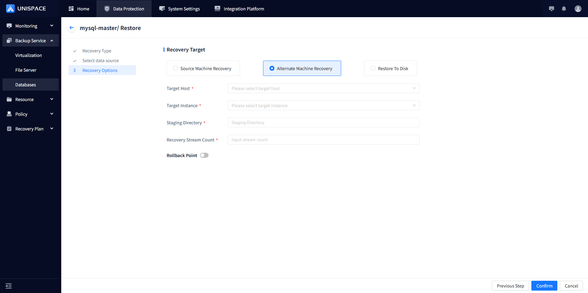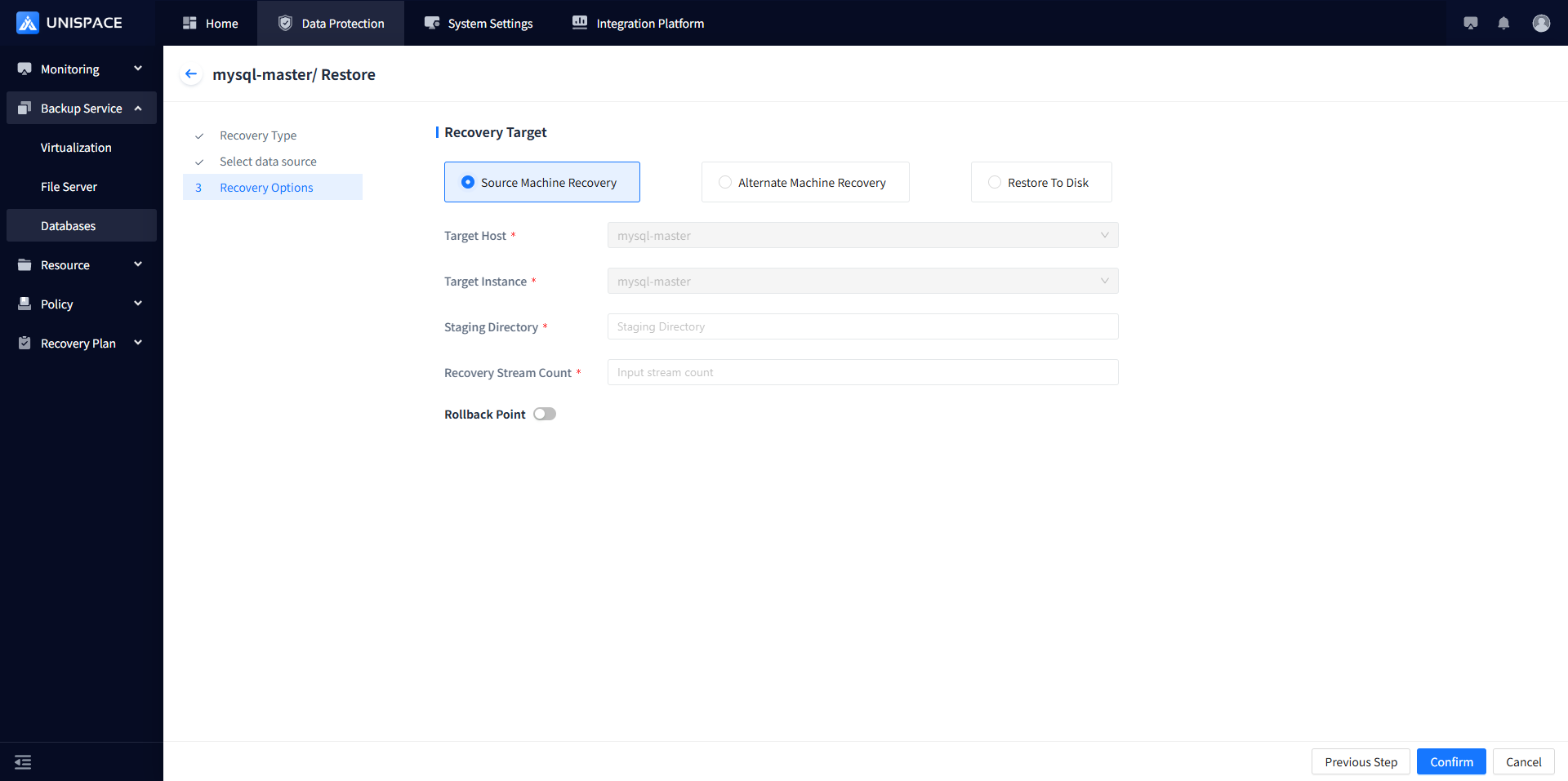 Step 5: Choose "Source Machine Recovery" as the recovery method, select the target host, target instance, and temporary directory, then click Confirm.