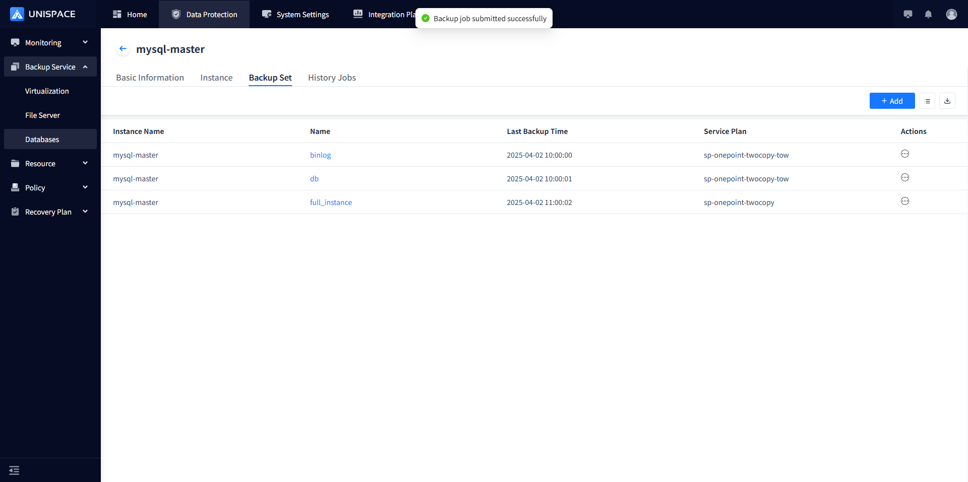 Step 2: Click Backup Set - Actions column - Binlog backup set - Backup.