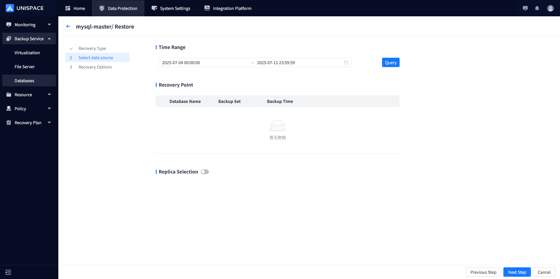 Step 4: Select the data source: choose the corresponding database and backup time for "Database Recovery"; select "Full Recovery".