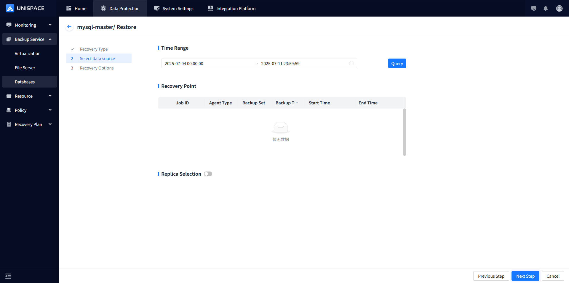 Step 4: Choose a recovery point either by "Recent Time" (last cycle recovery point) or by specifying a time range. Select the job ID of the "Recovery Point", and click Next.