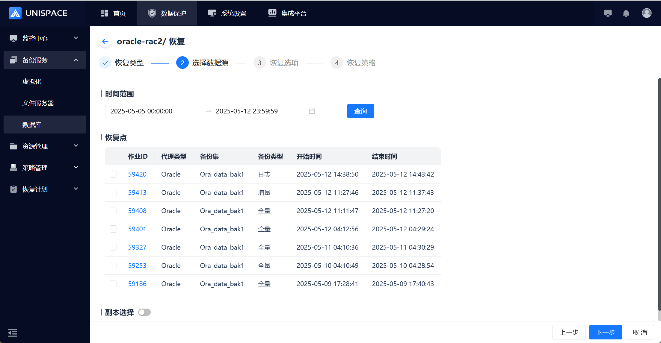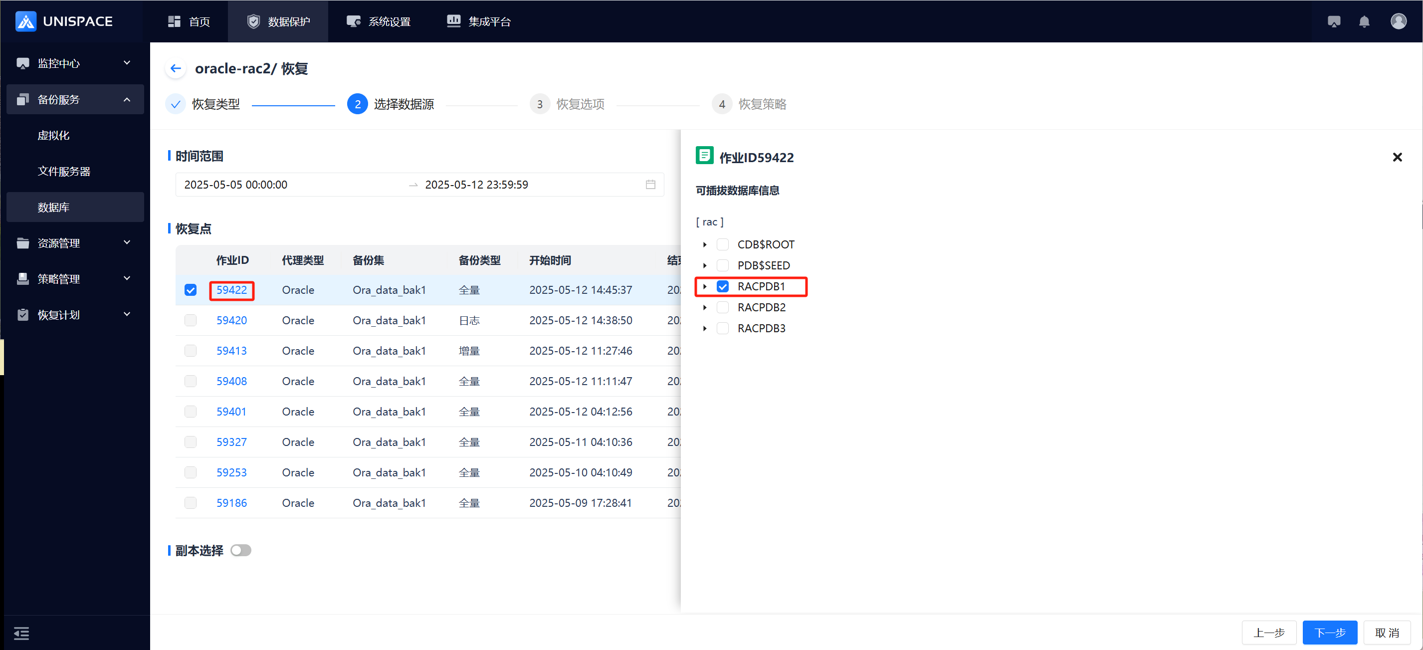 Step 3: Select the restore point (you can search by time range), check the restore point, and click the Job ID of the restore point. The right panel will display the available pluggable databases (PDBs). Check the PDB database to be restored and click Next.
