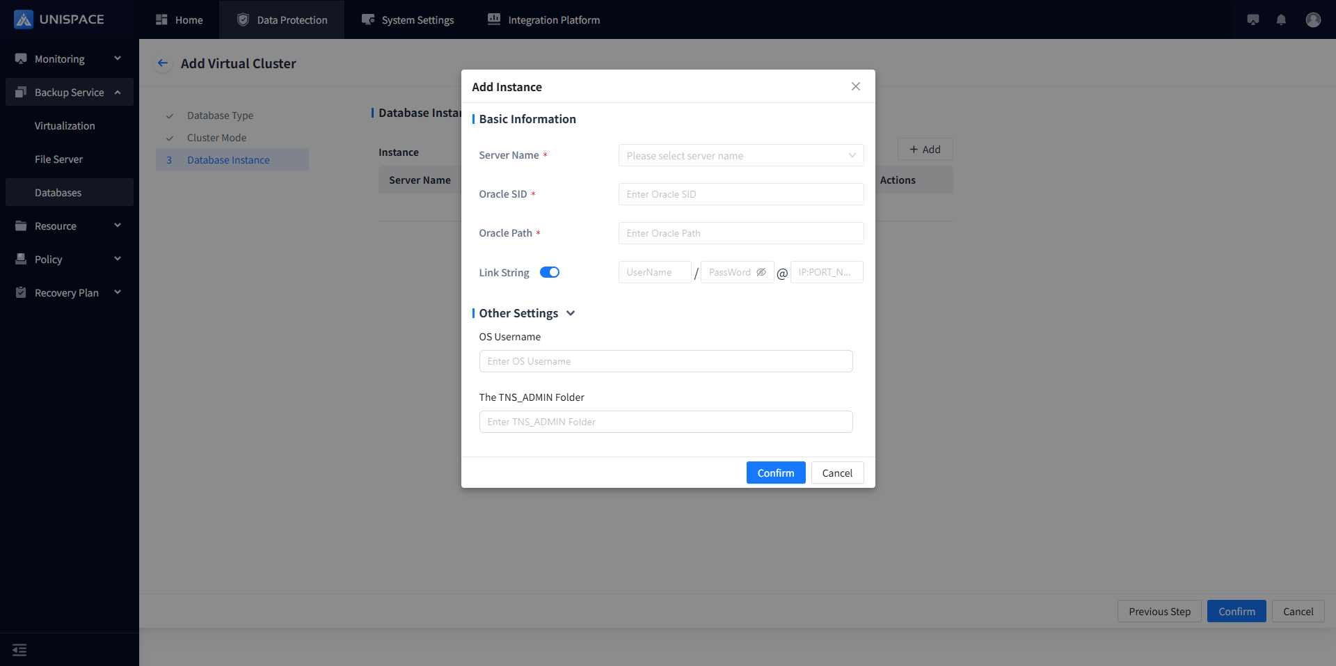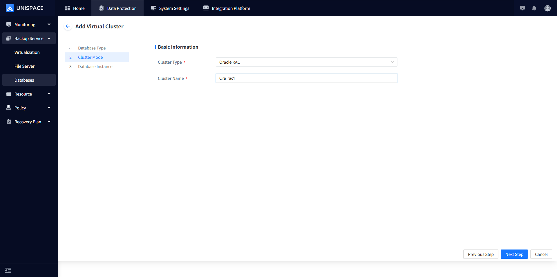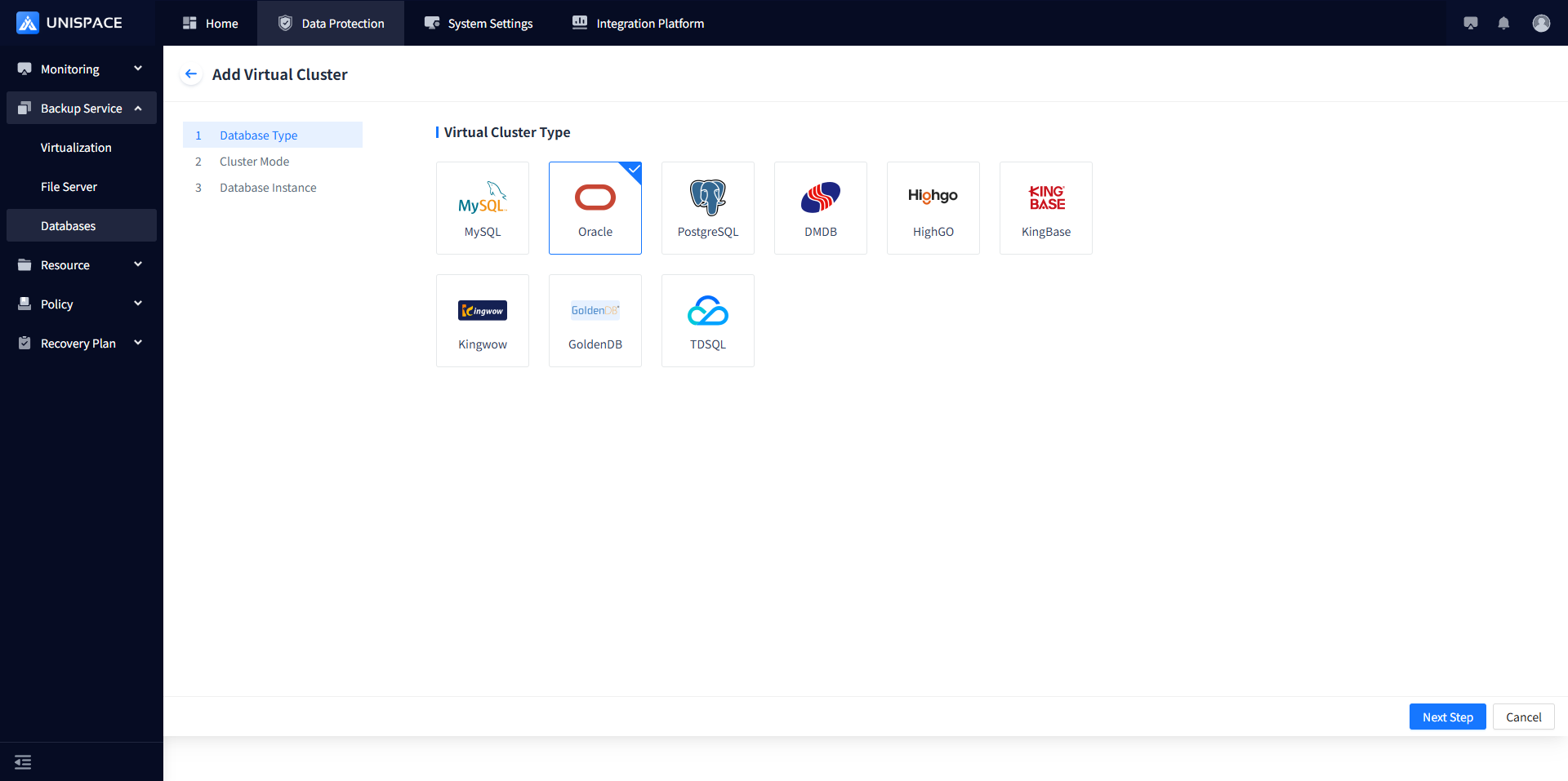 Step 3: Select Oracle, click Next Step, enter the cluster name, and click Next Step.