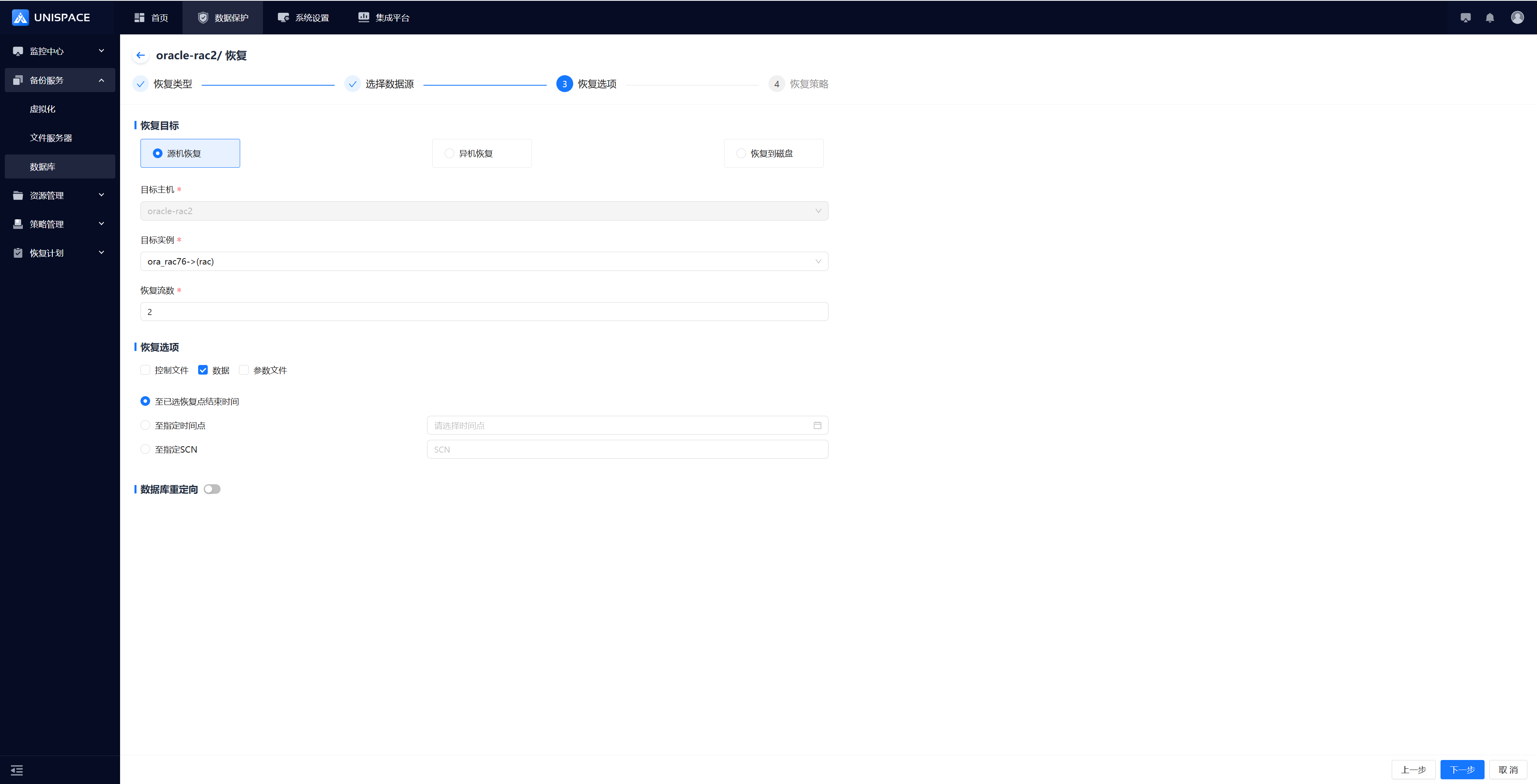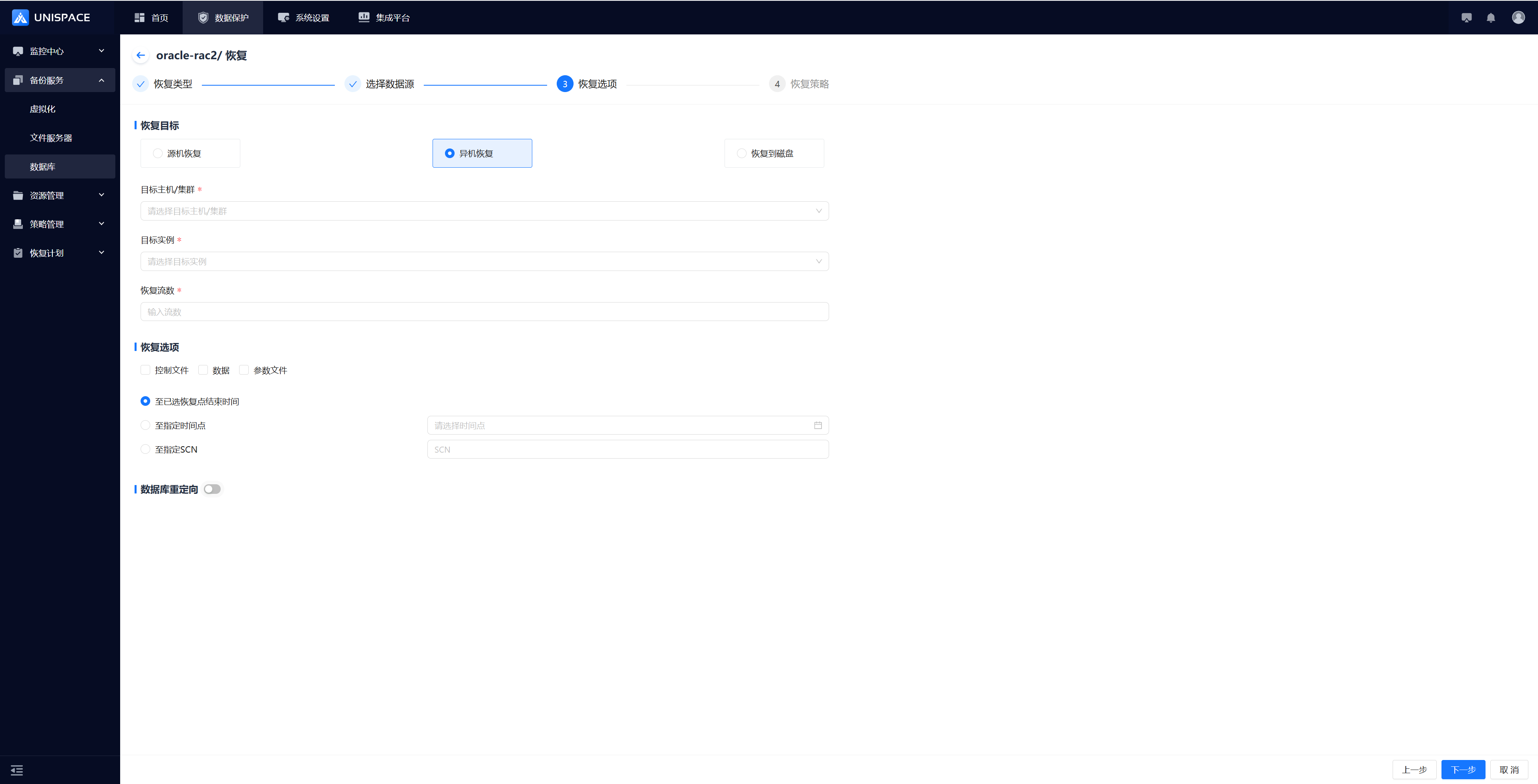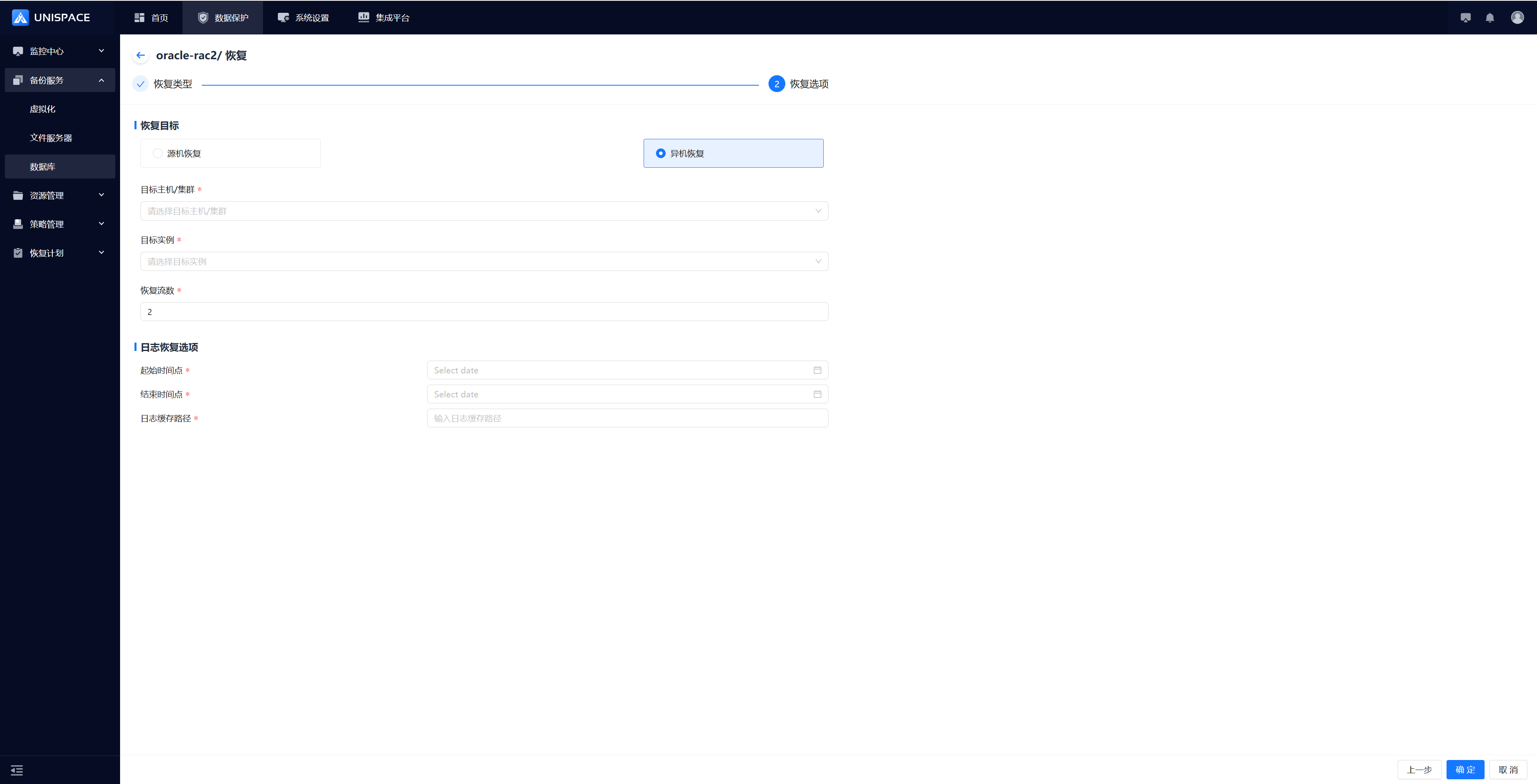 | Restore Target | Radio button, default is Off-Machine Restore | Source machine recovery (original cluster); Off-machine recovery: register oracle client standalone node/cluster |