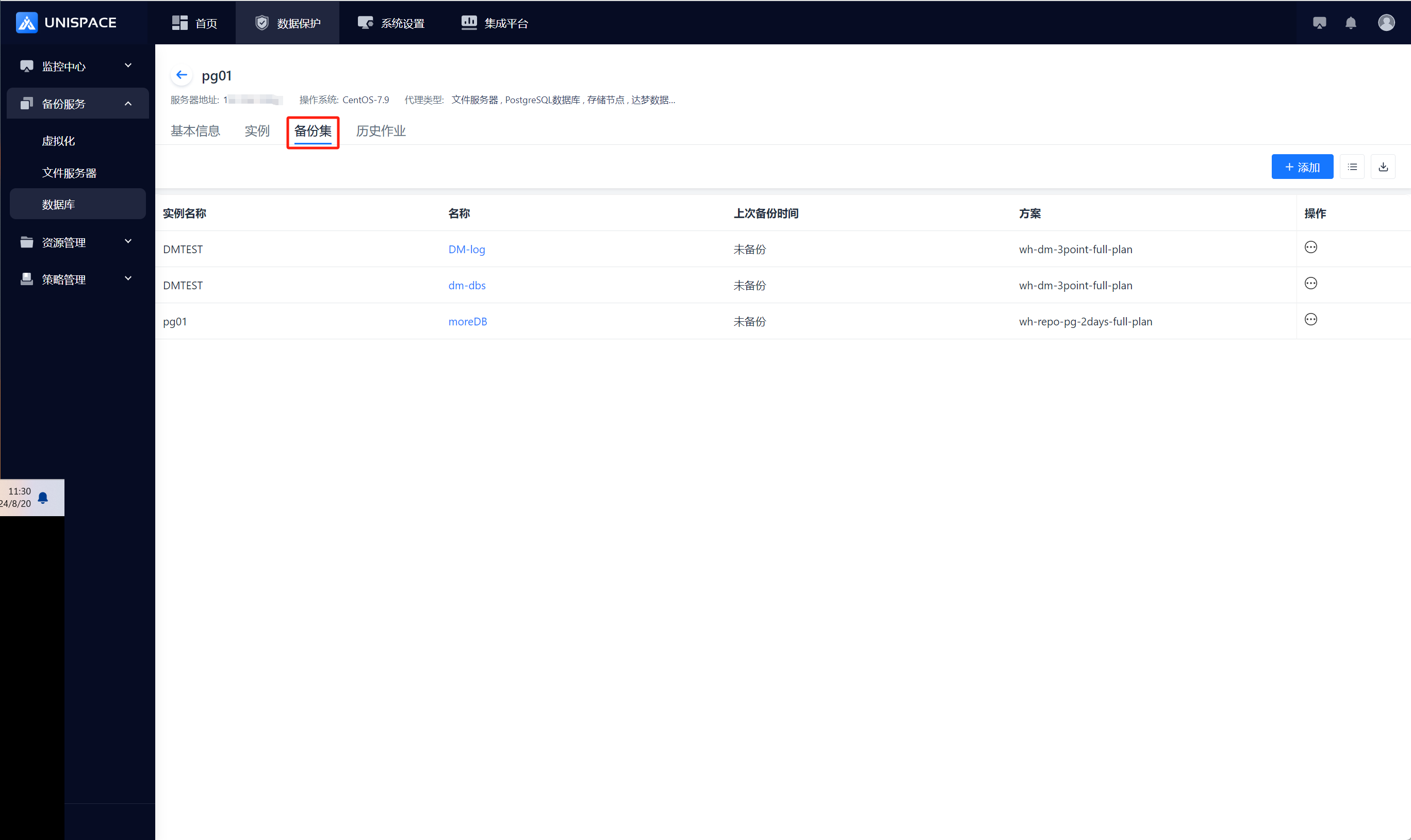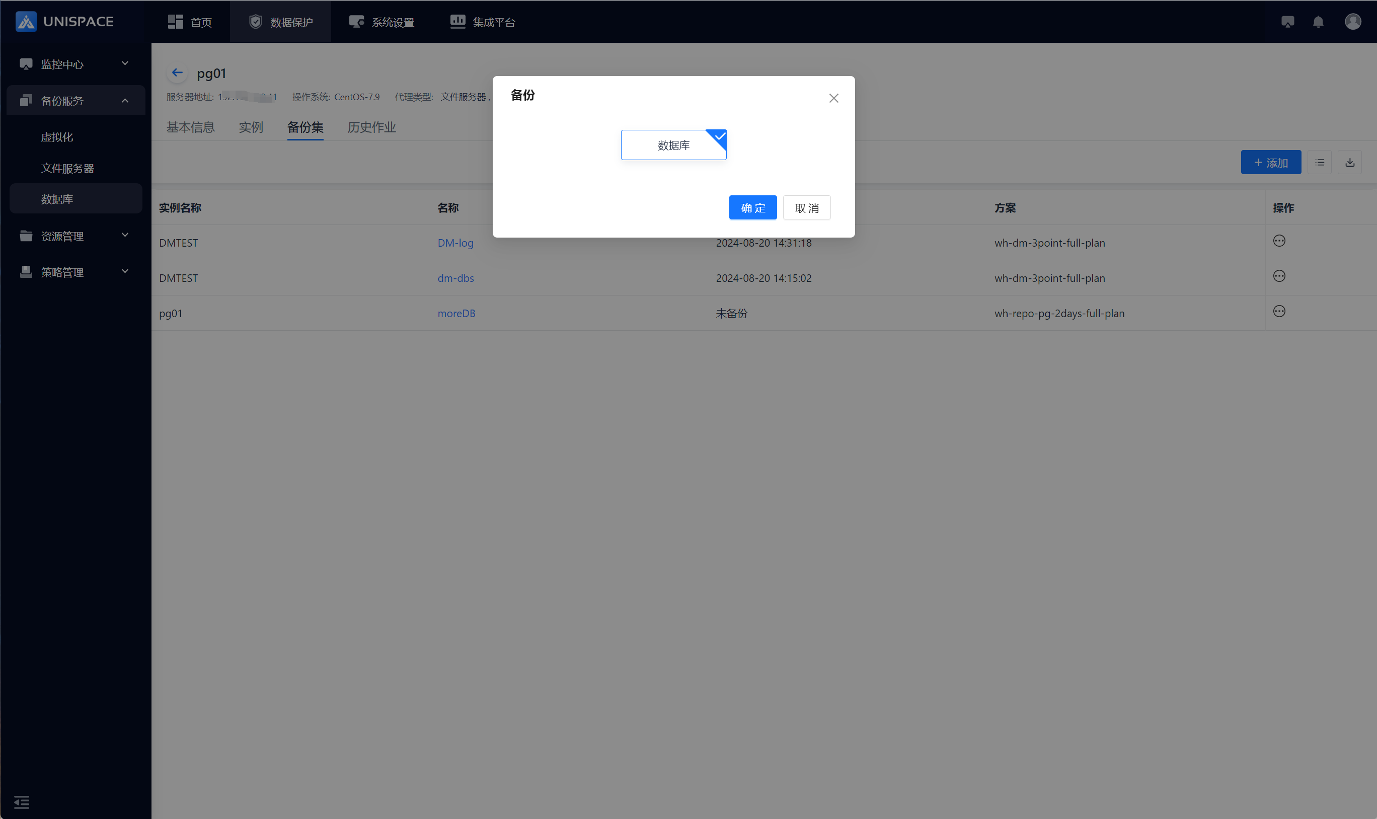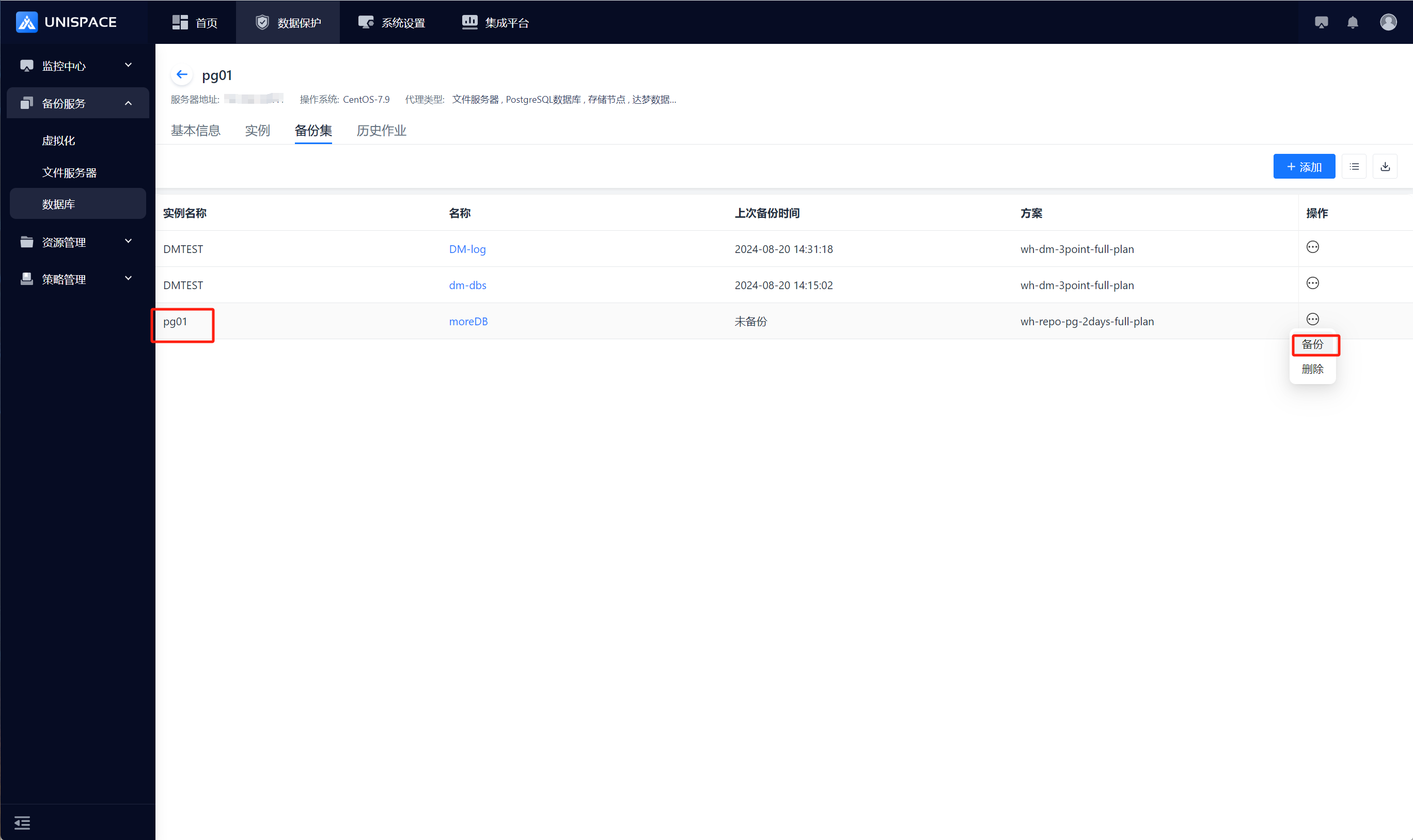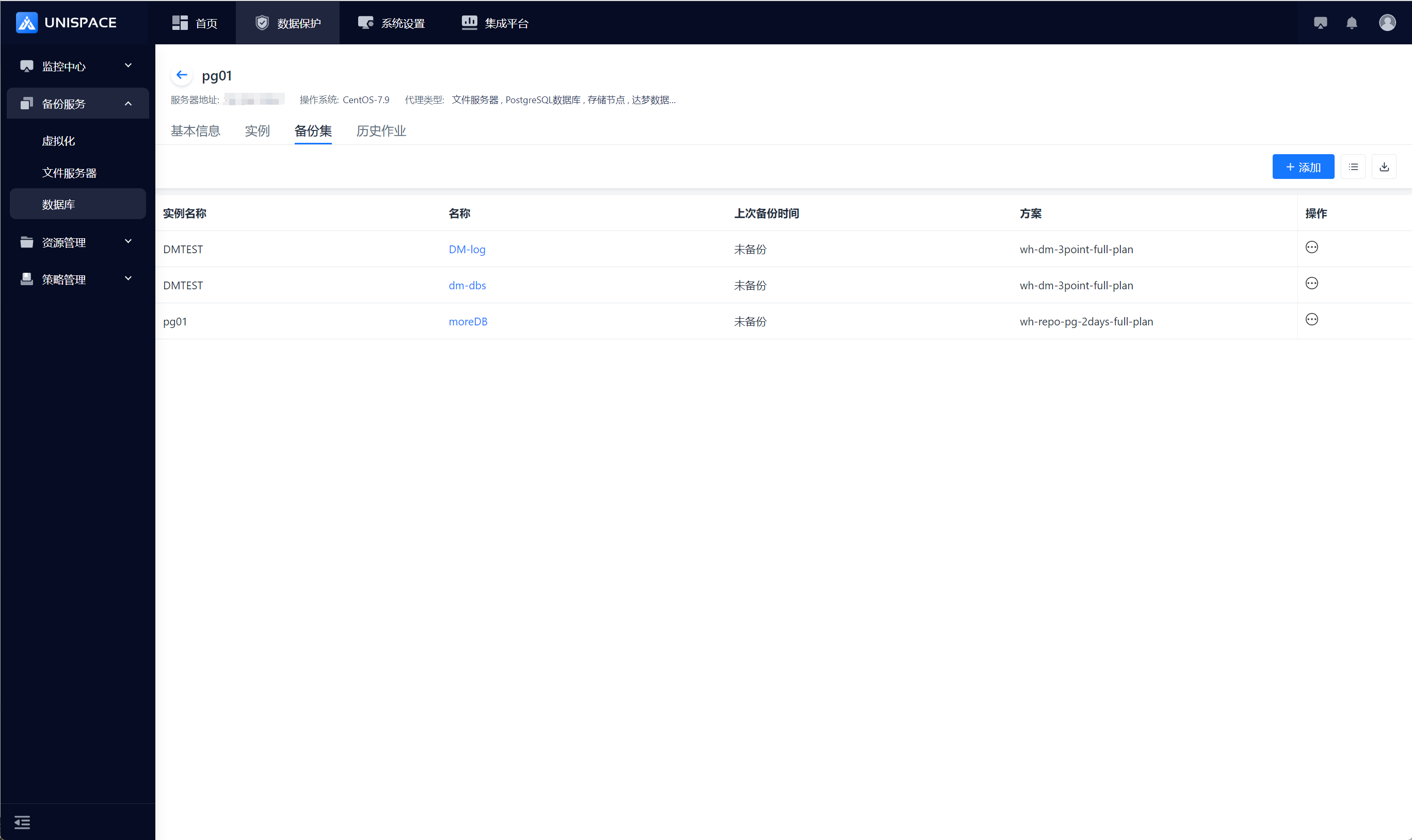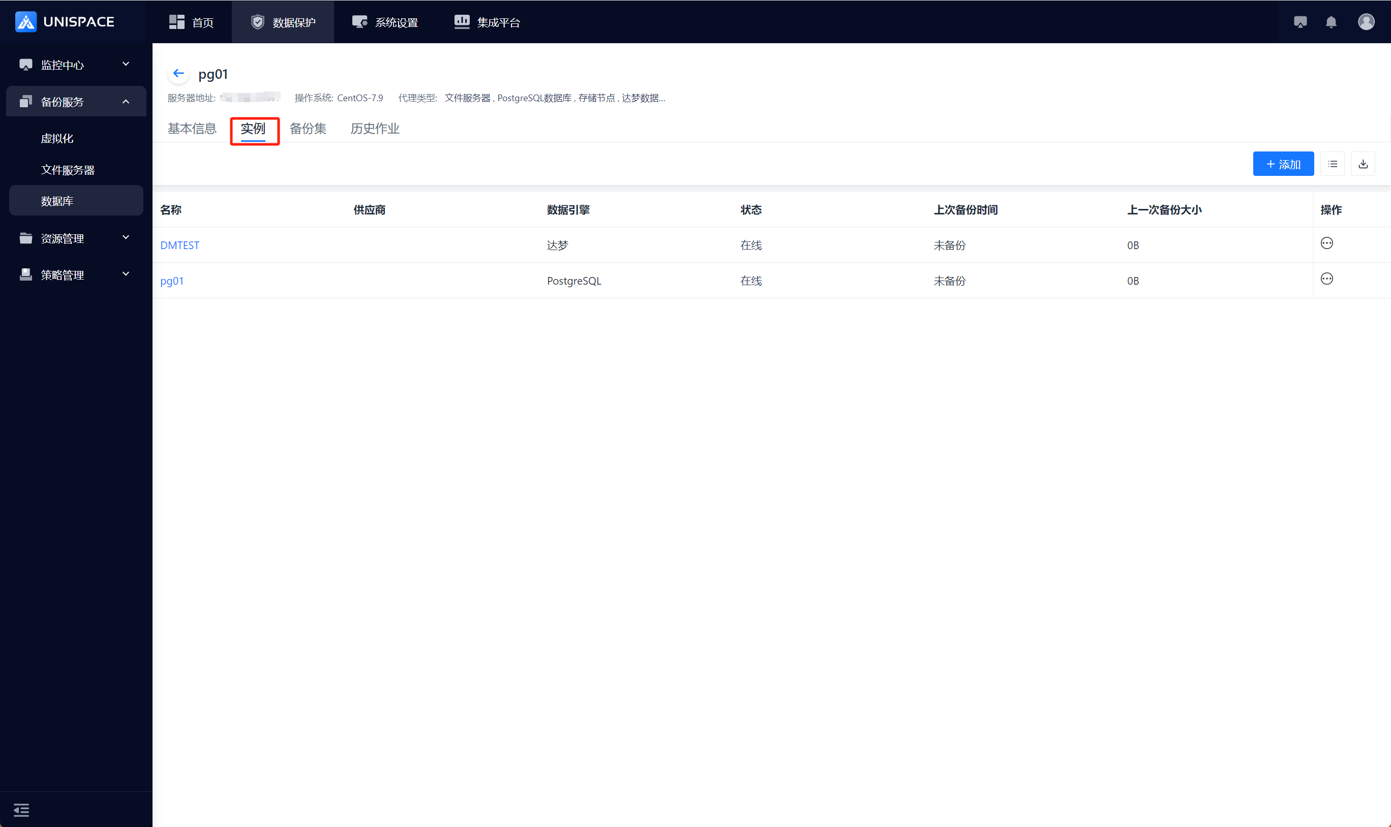 Step 1: Click on the system menu Backup Service - Database list, select "Server Name" to enter the database instance page.