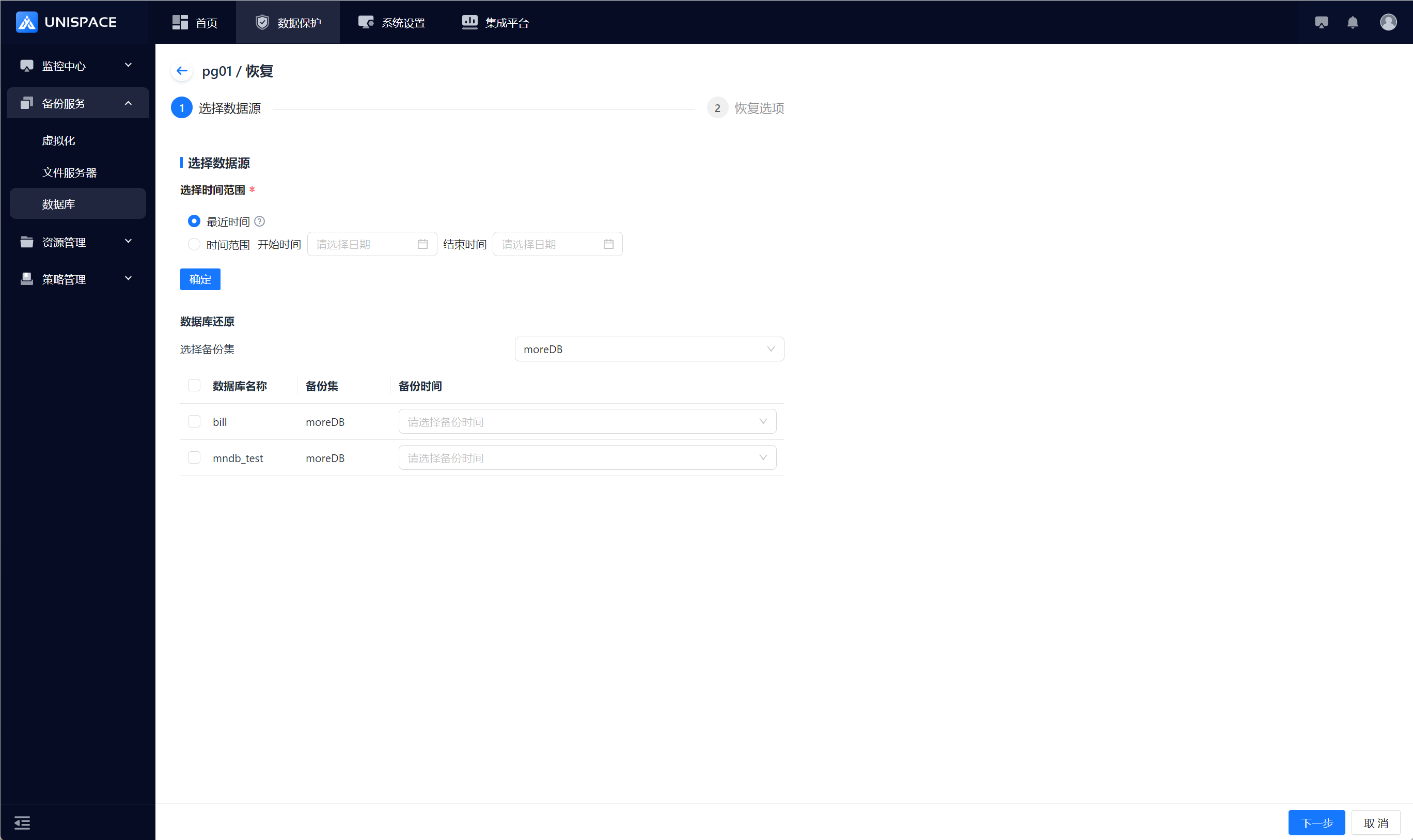 Step 3: A restore window will pop up. Select the recovery point based on "Recent Time" (last cycle recovery point) or a specific time range. Select the "Backup Set", choose "Database" and "Backup Time", and click Next.