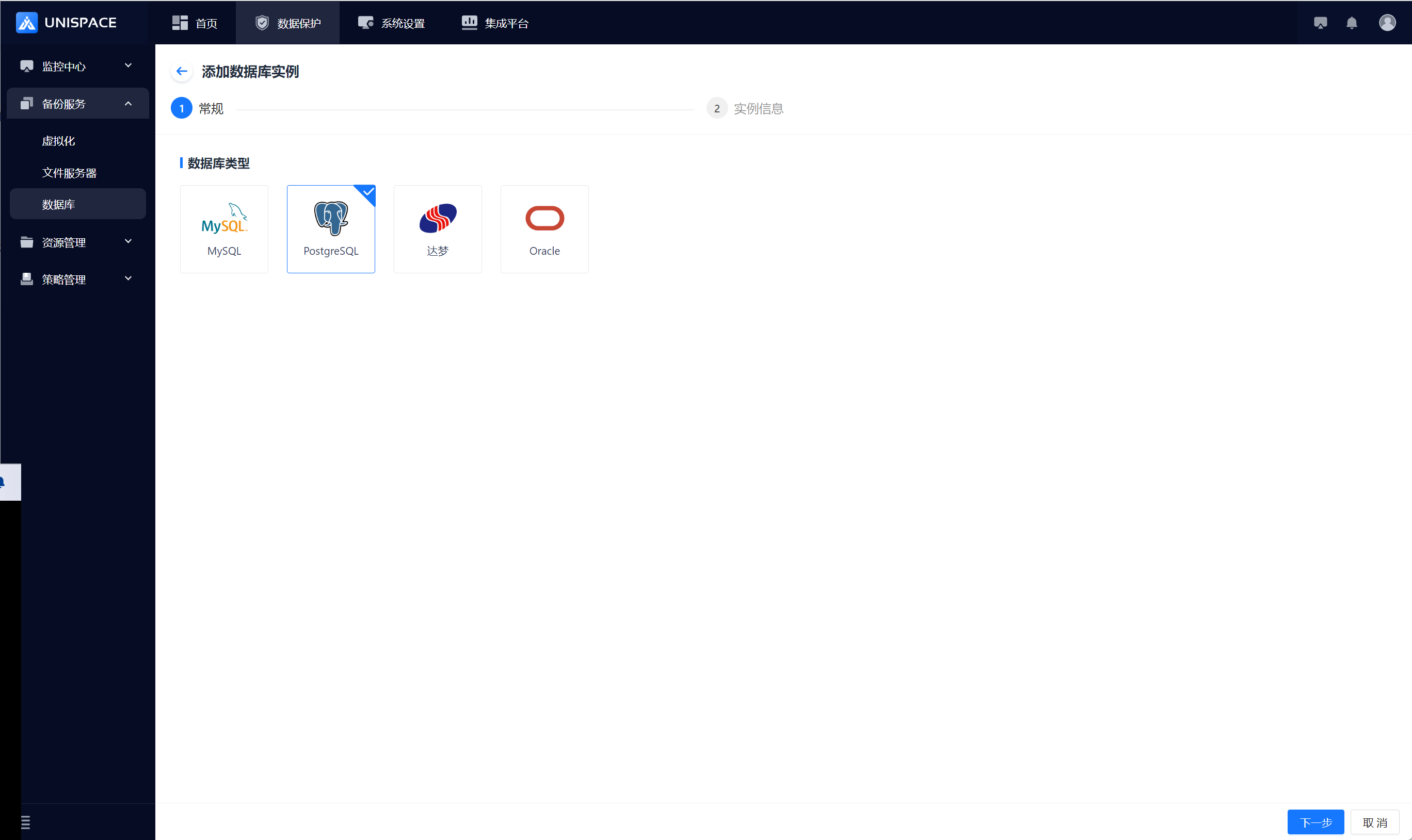 | Database Type | Single selection, required, default is MySQL | Select PostgreSQL |