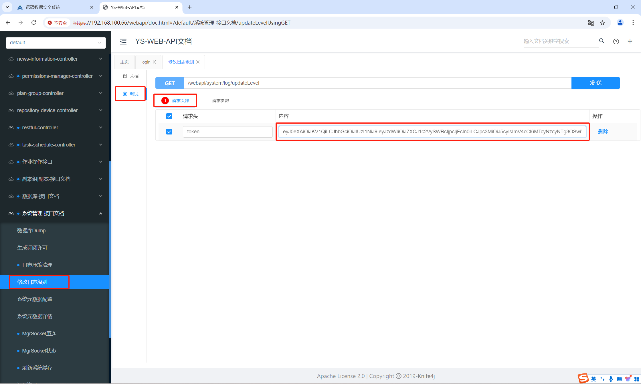Go to Change Log Level > Try it out > Request Headers, and paste the token.