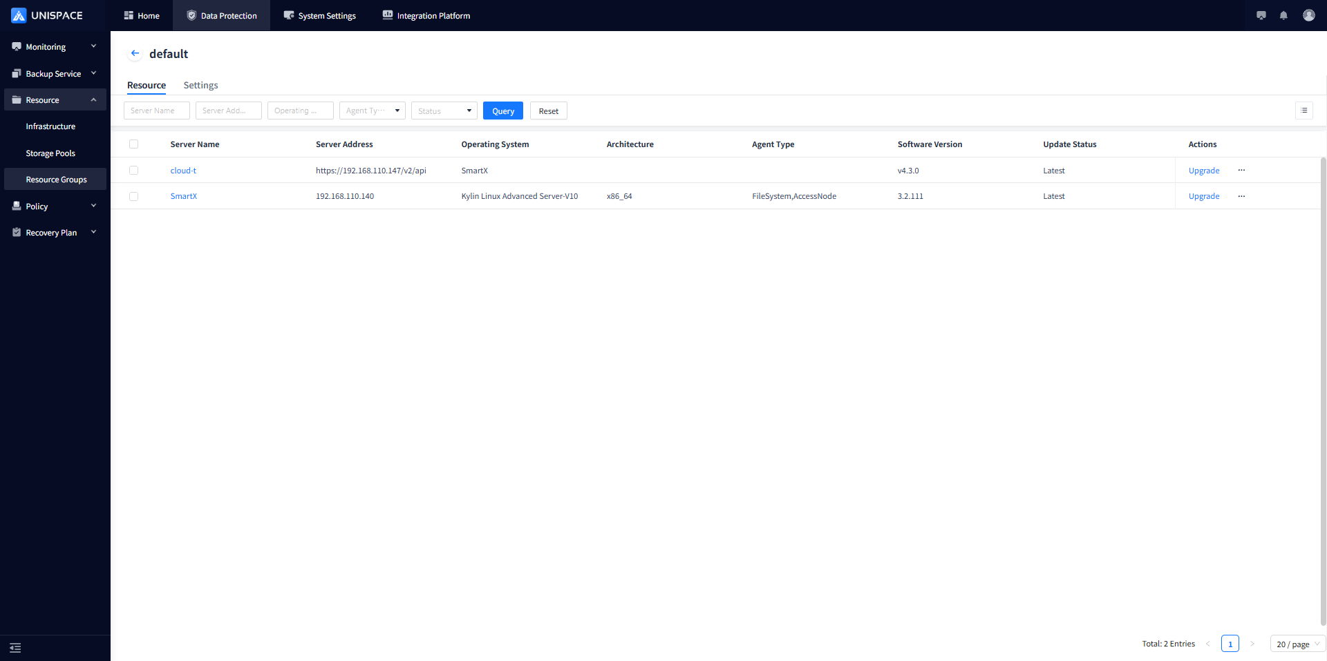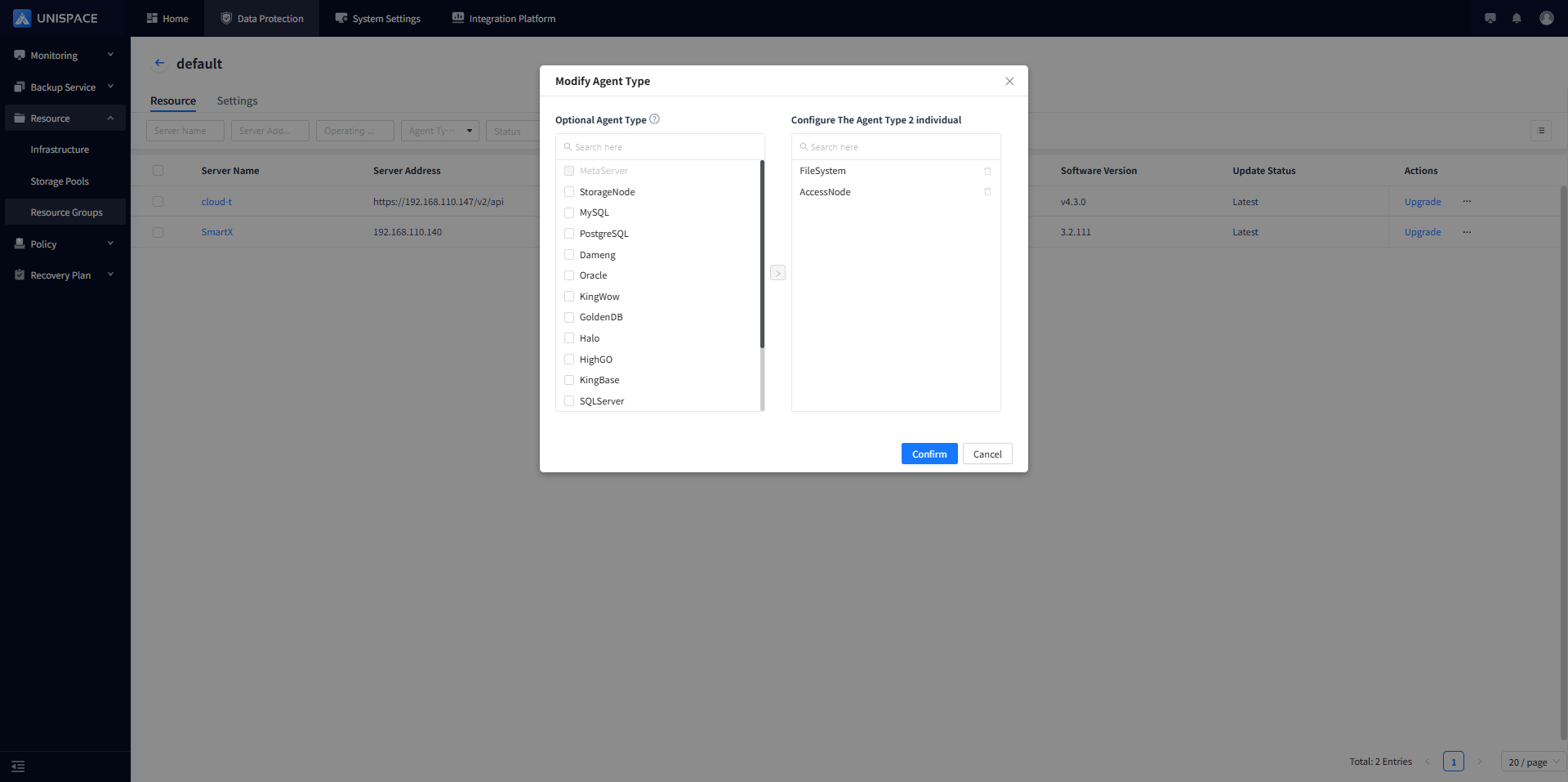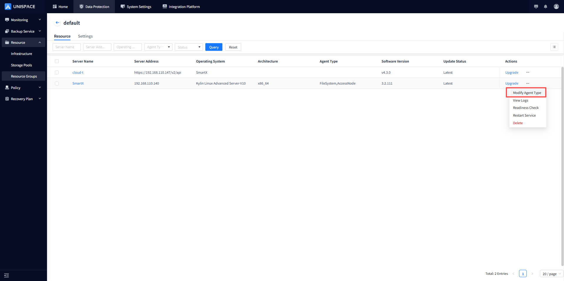 unis_cn script to register the clientNote: Applicable to version 3.2 and above – defaults to file registration. To add additional agent types, modify the agent type in the resource group and restart: