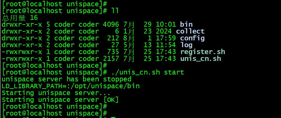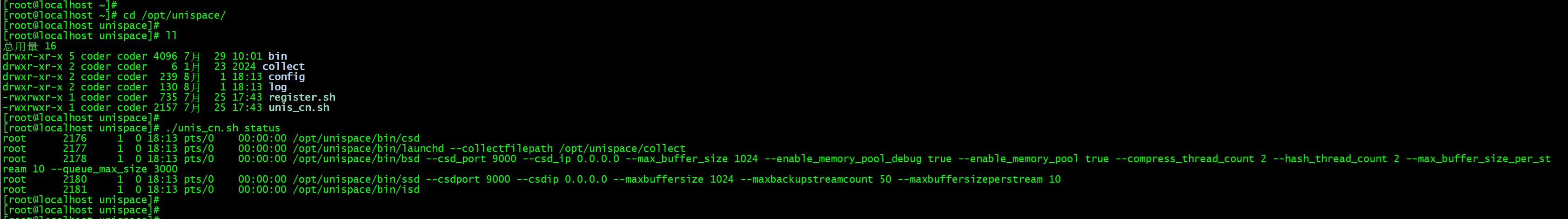 After installation is complete, you can go into the installation directory and use the script to check the UniSpace service status: