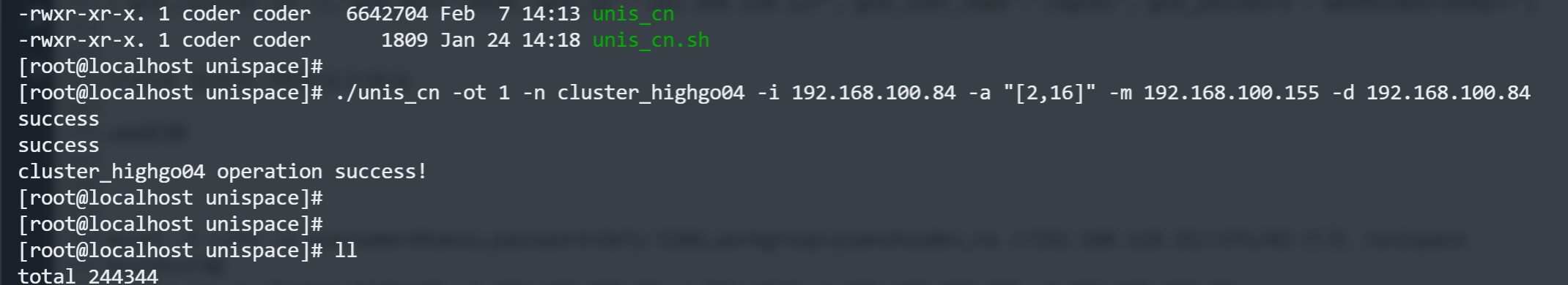 -ot — 1 for registration, 2 for update-n — Storage Node name (customizable)-i — Storage Node IP address (local IP)./unis_cn -ot 1 -n highgo84 -i 192.168.100.84 -m 192.168.100.155