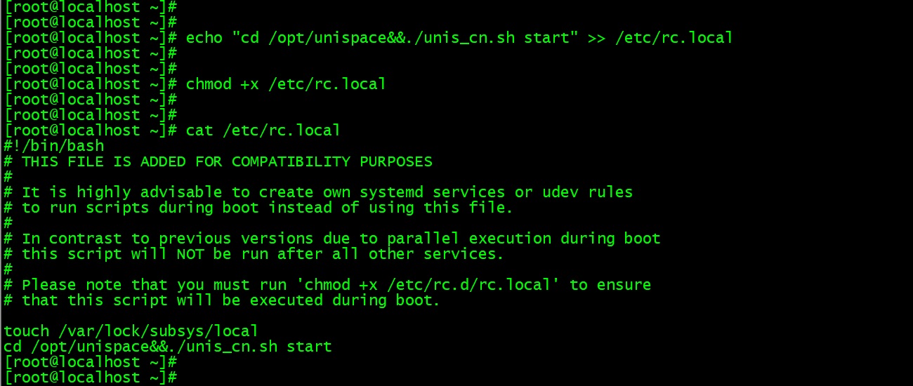 echo "cd /opt/unispace&&./unis_cn.sh start" >> /etc/rc.local