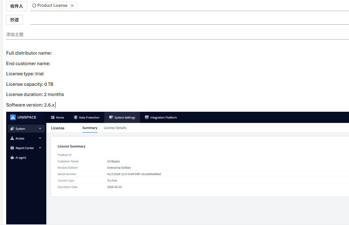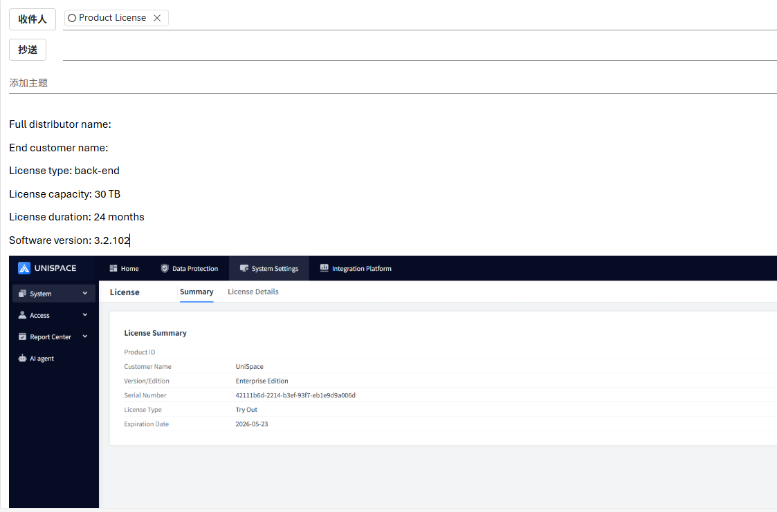 This mailbox is the only official channel for license application requests. Other channels, such as WeChat or the technical support mailbox, no longer accept license request submissions.