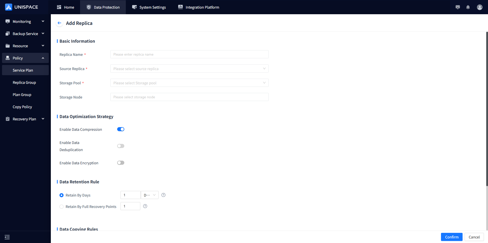 | Replica Name | Text input box, required, user-defined | The name should not exceed 50 characters |