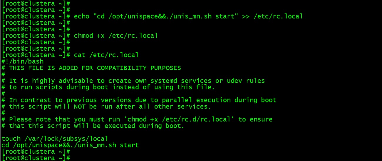 echo "cd /opt/unispace&&./unis_mn.sh start" >> /etc/rc.local