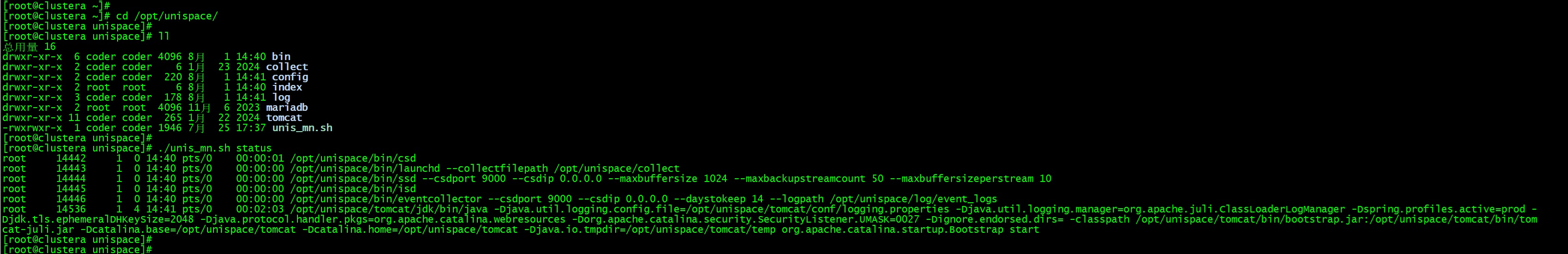 After completing the installation, enter the installation directory and use the script to check the UniSpace service status: