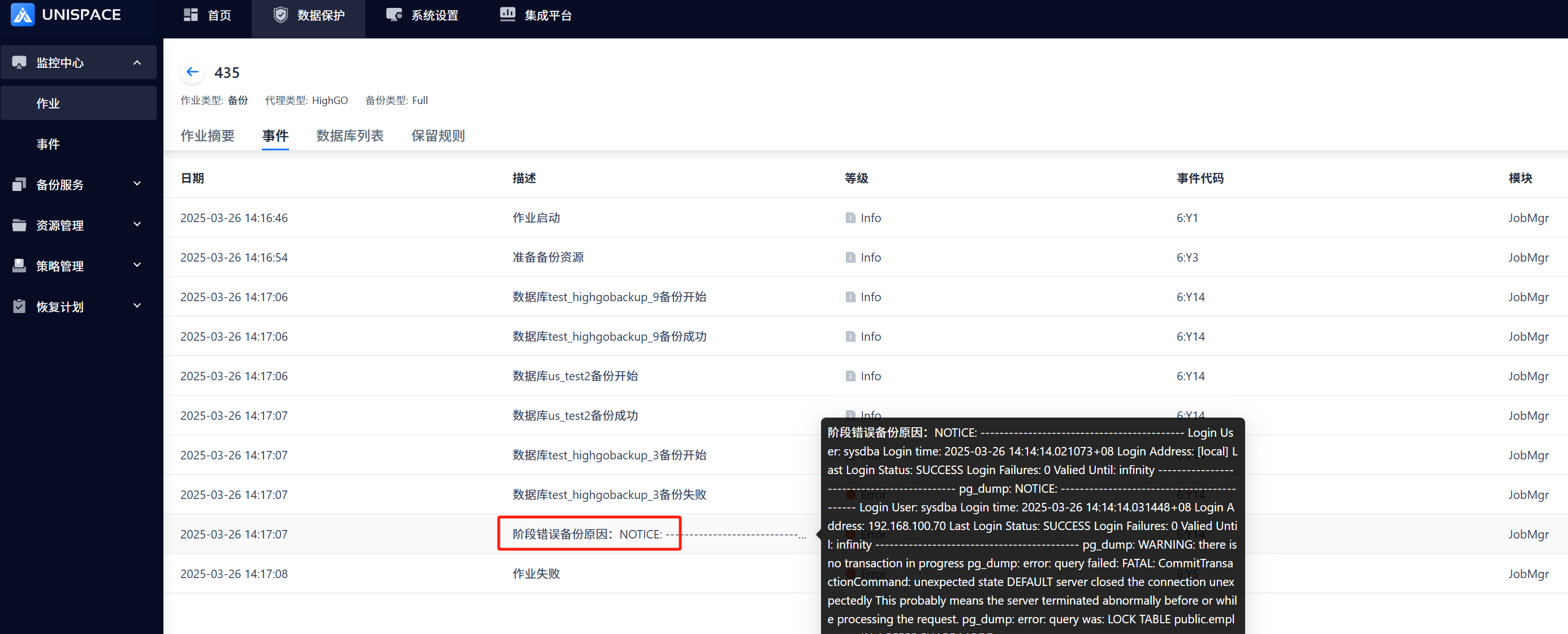 1 For failed database-type jobs, you can check the events in the job history. The failure event notification is shown in the figure below: